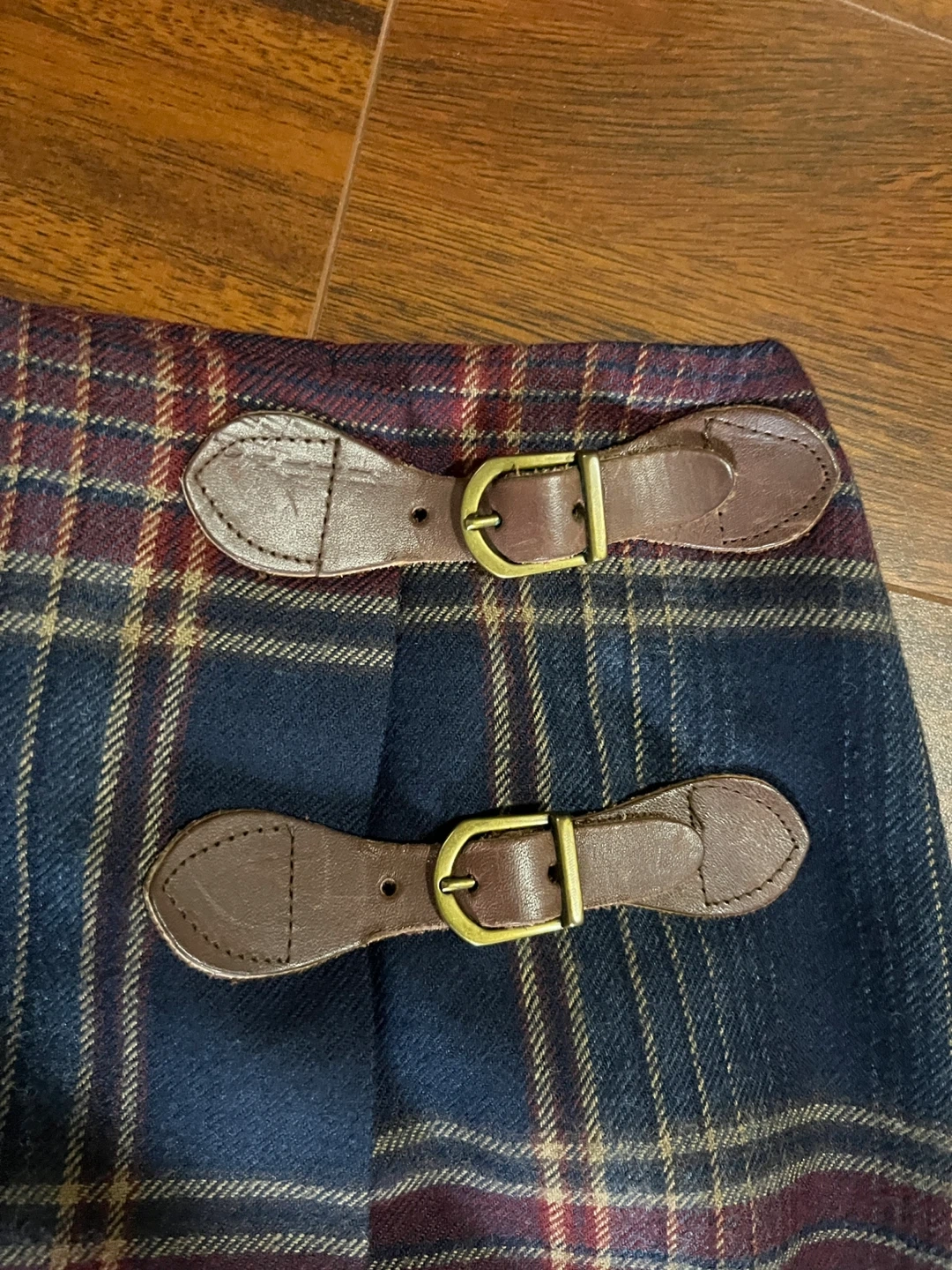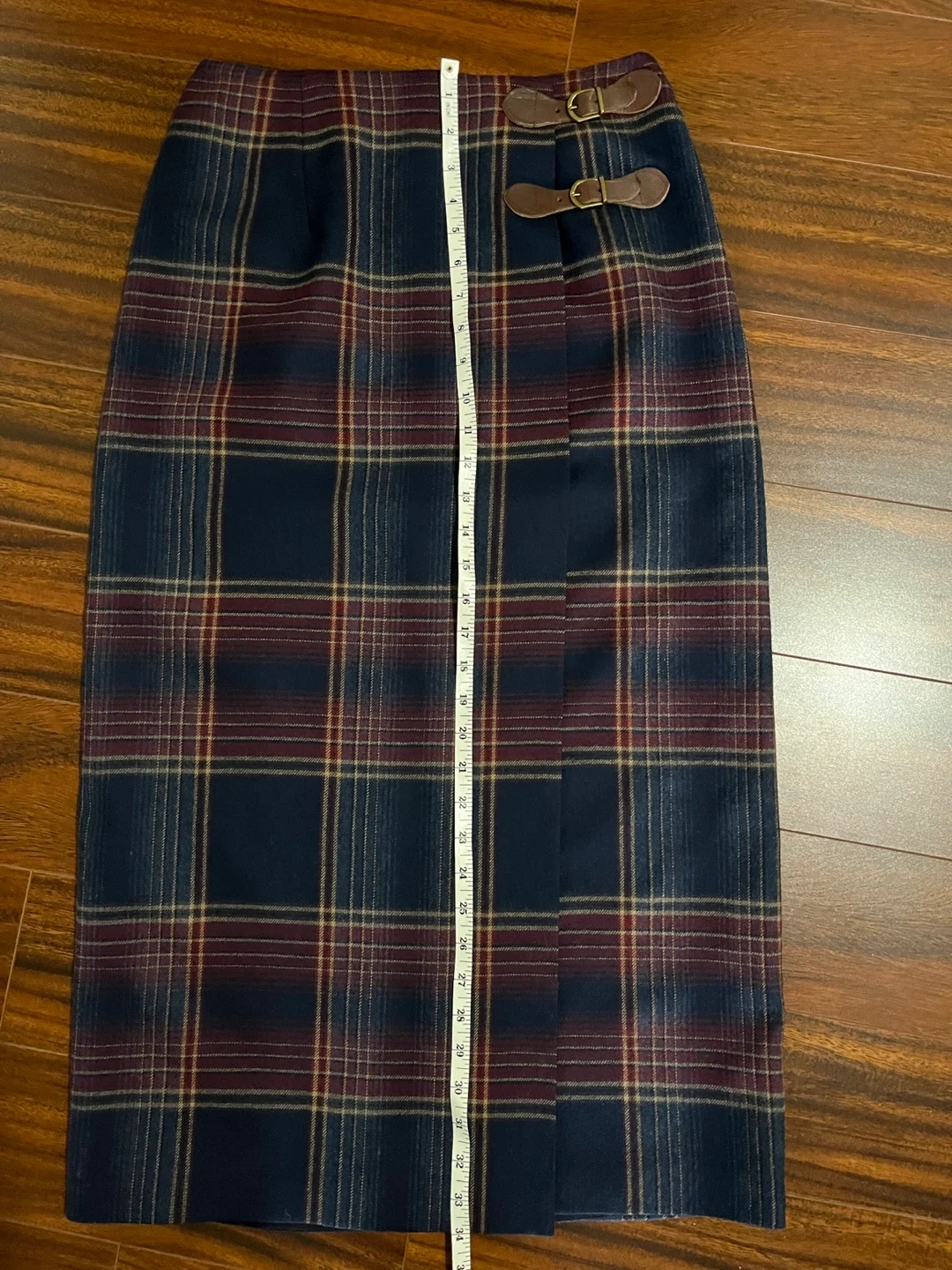 Talbots plaid wool midi skirt in navy and burgundy. Features two side buckles, fully lined, and made in the U.S. 100% wool shell, 100% acetate lining. Excellent condition and from a smoke-free home.