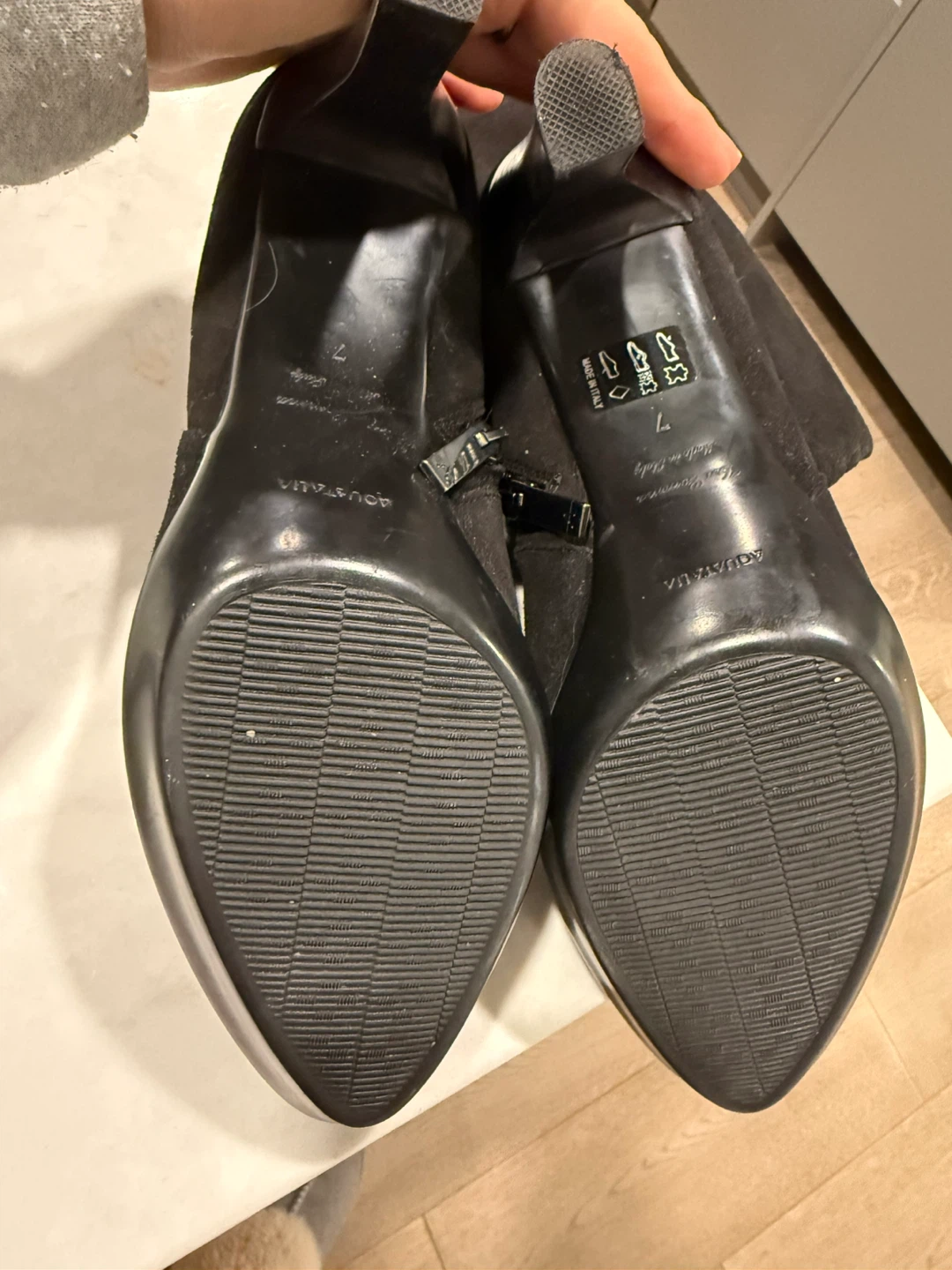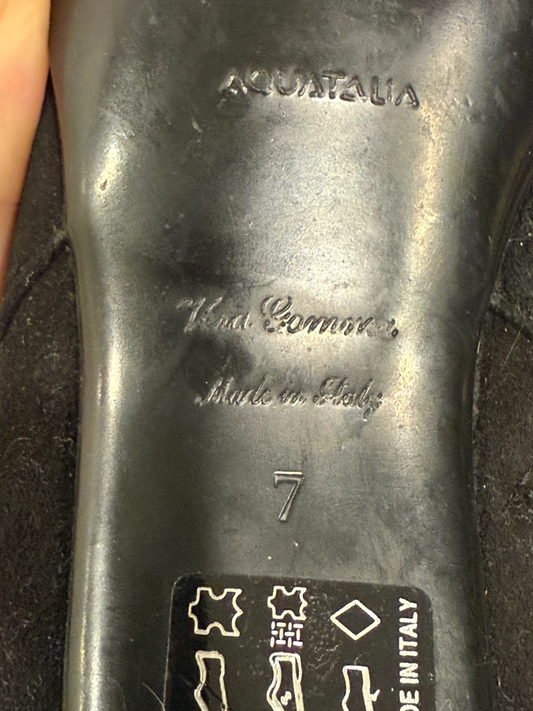 Selling a pair of Aquatalia black suede boots in size 7. These stylish boots are made in Italy and feature a sleek design with a comfortable heel. Perfect for adding a touch of elegance to any outfit!