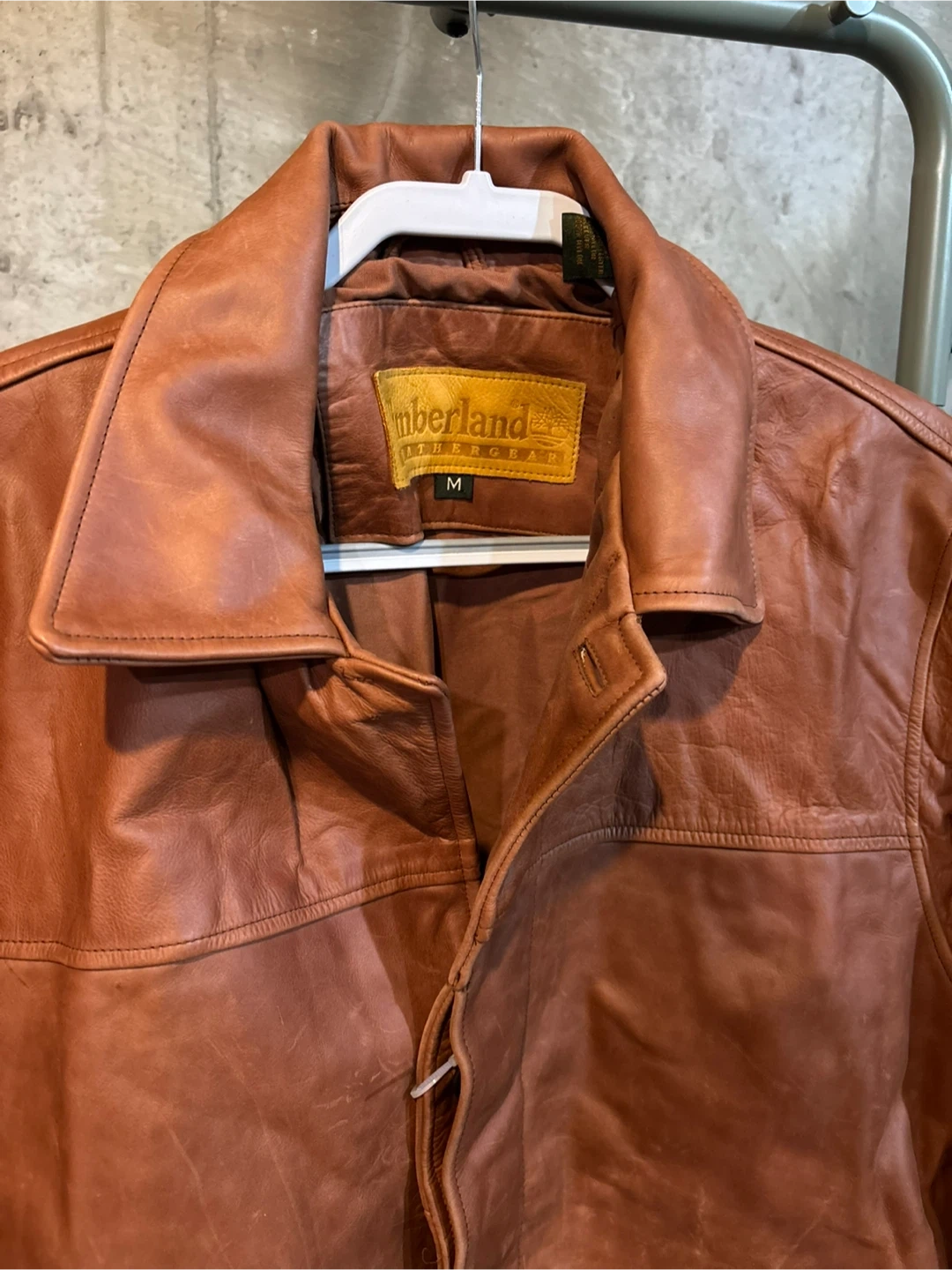 Here's a Timberland leather jacket in size M. It's a stylish piece with a classic look. Perfect for adding a touch of ruggedness to your wardrobe!