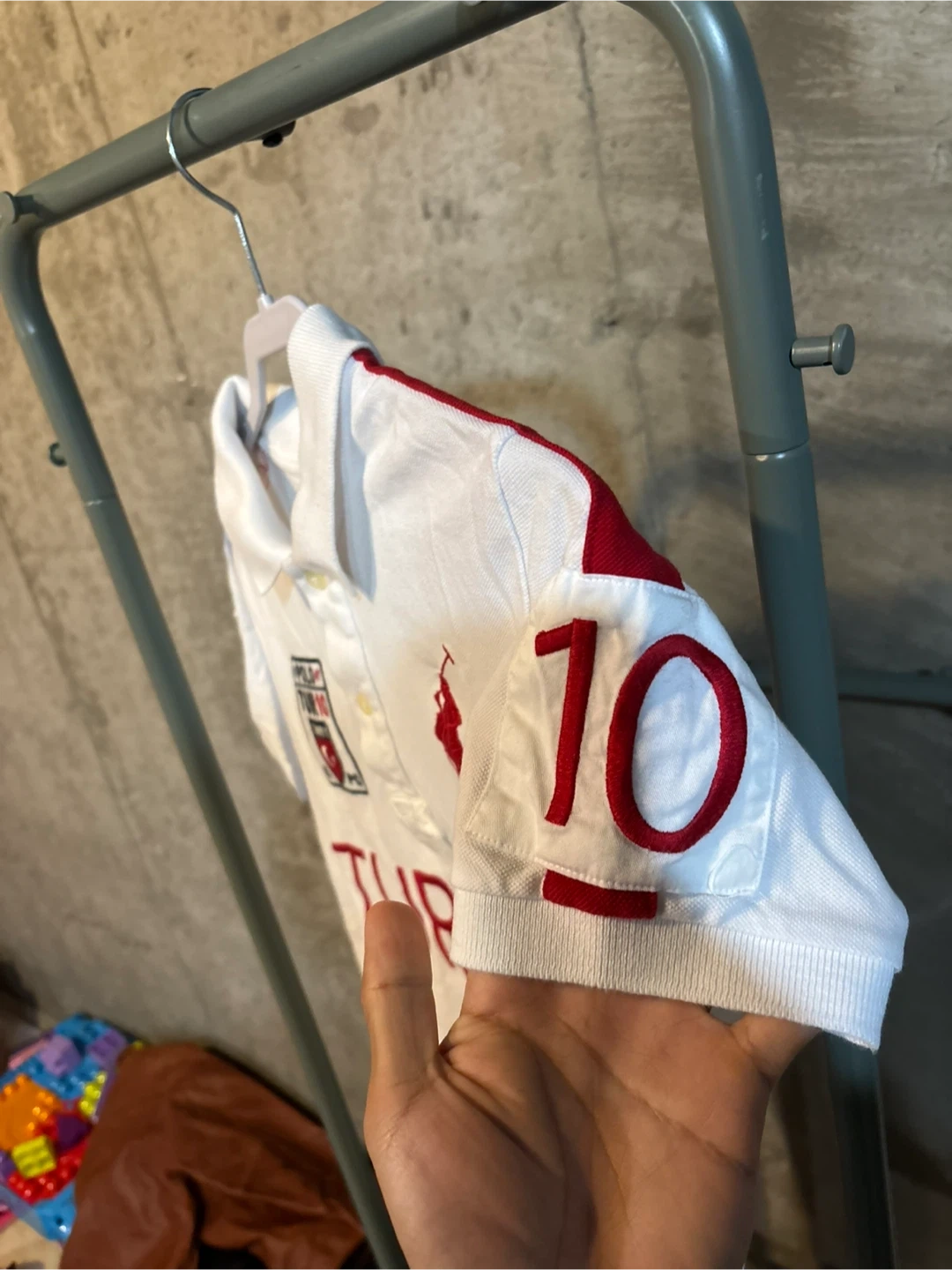 Here's a Ralph Lauren polo shirt with "Turkey" embroidered on the front and "TUR 10" on the back! It's white with red accents and the classic polo logo