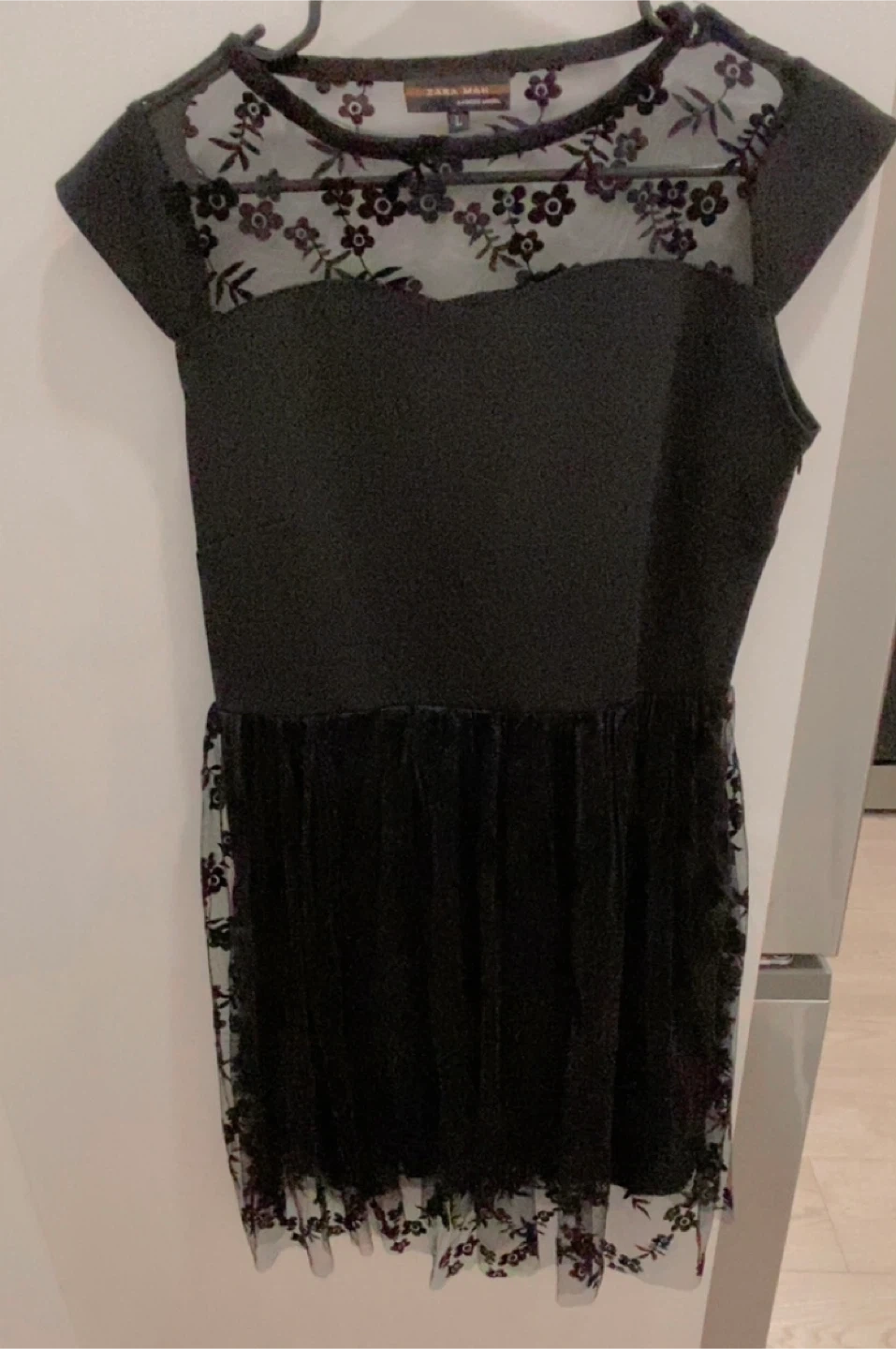 Selling a new Zara Woman black dress! It features a lovely floral pattern on the sheer fabric.