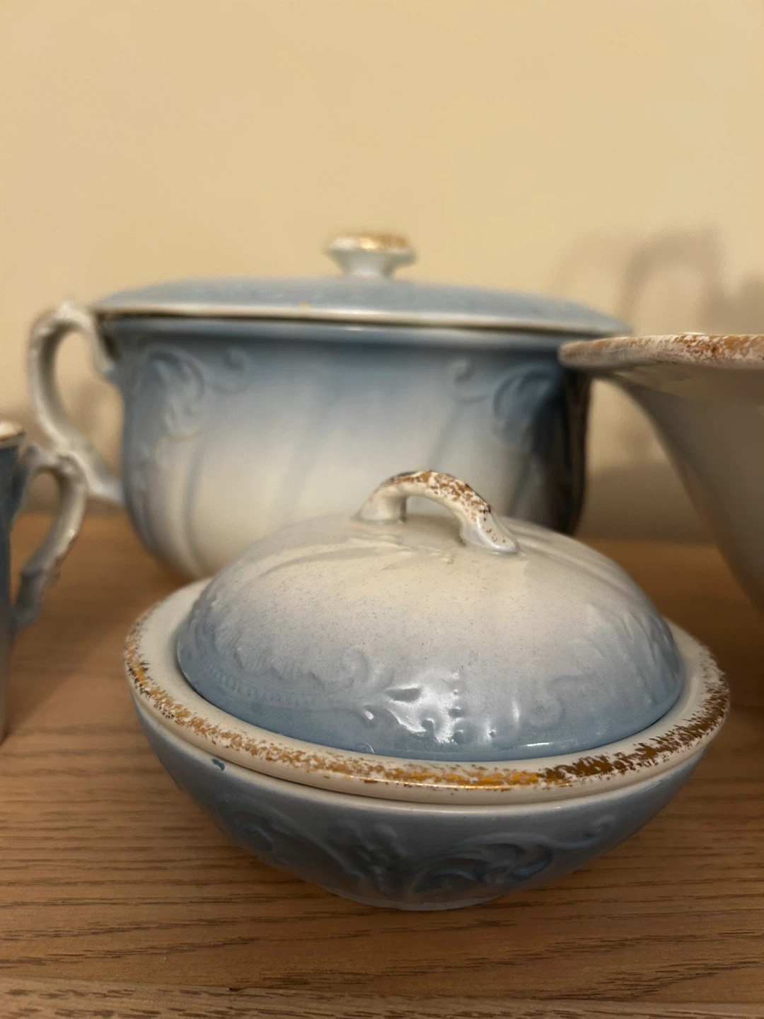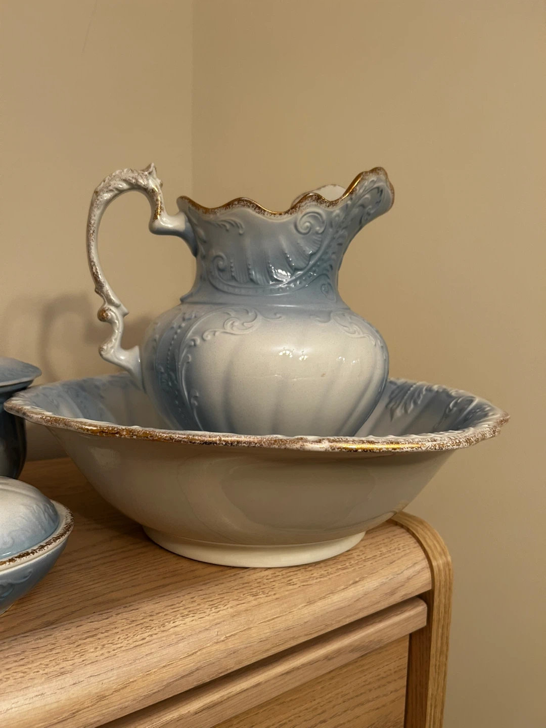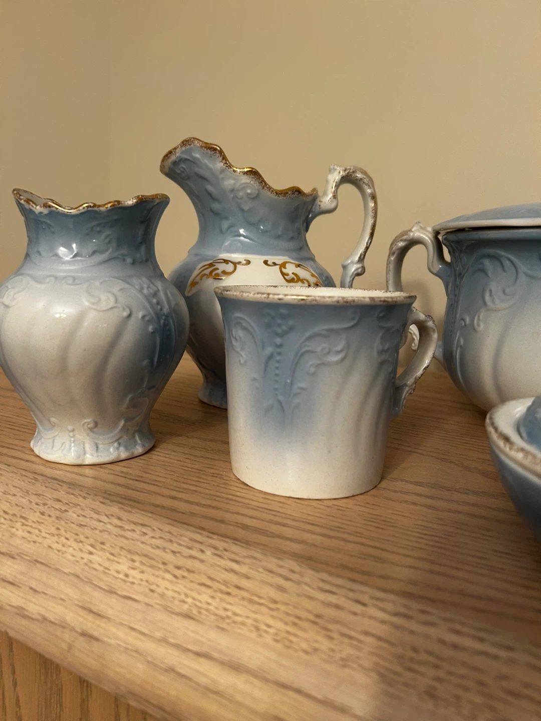 Selling a beautiful vintage 7 piece wash basin set! It features a lovely light blue and white gradient with delicate gold trim. Perfect for adding a touch of antique charm to your home