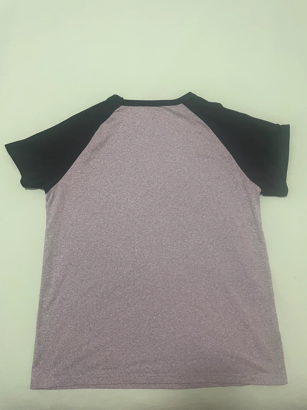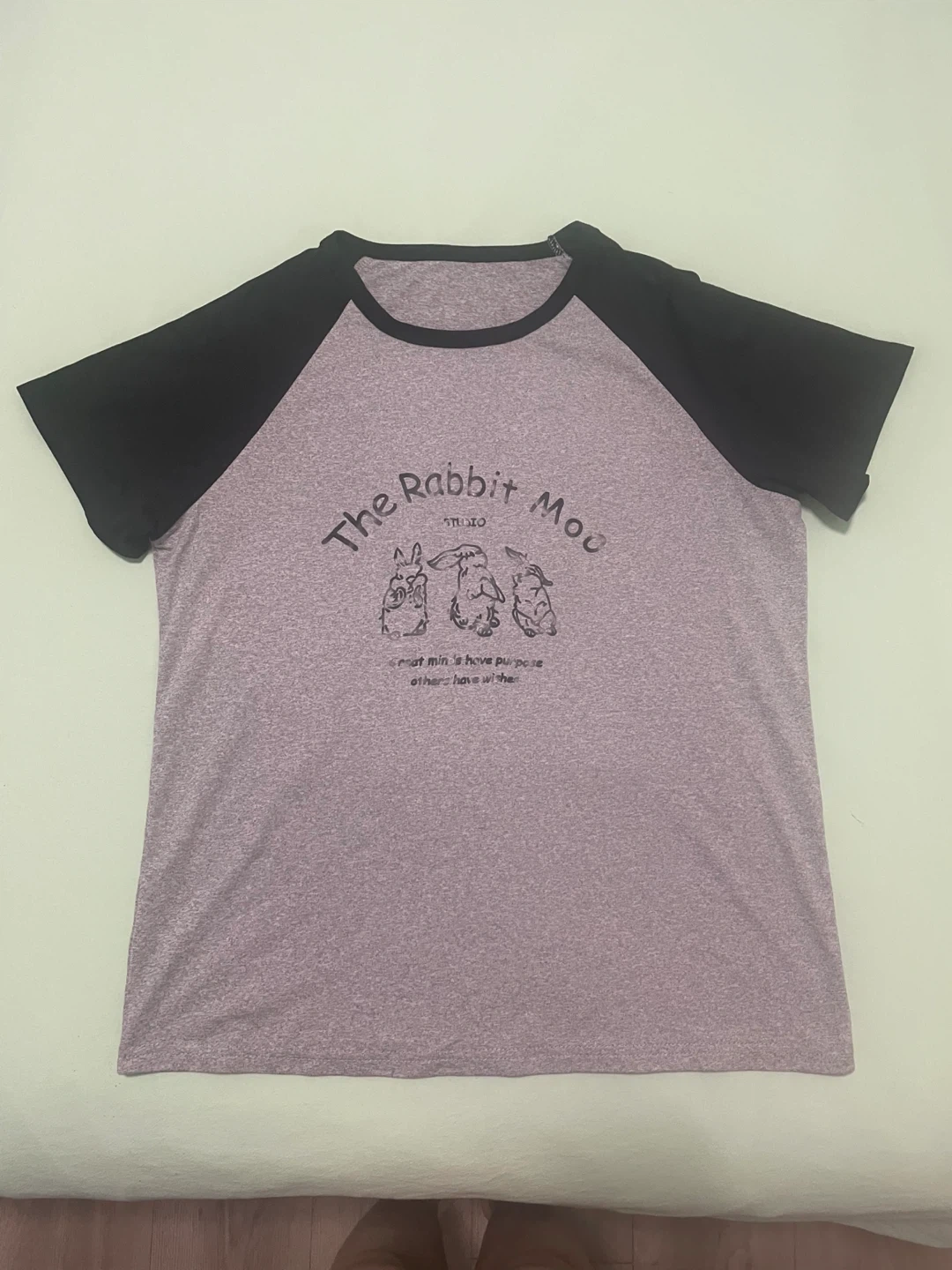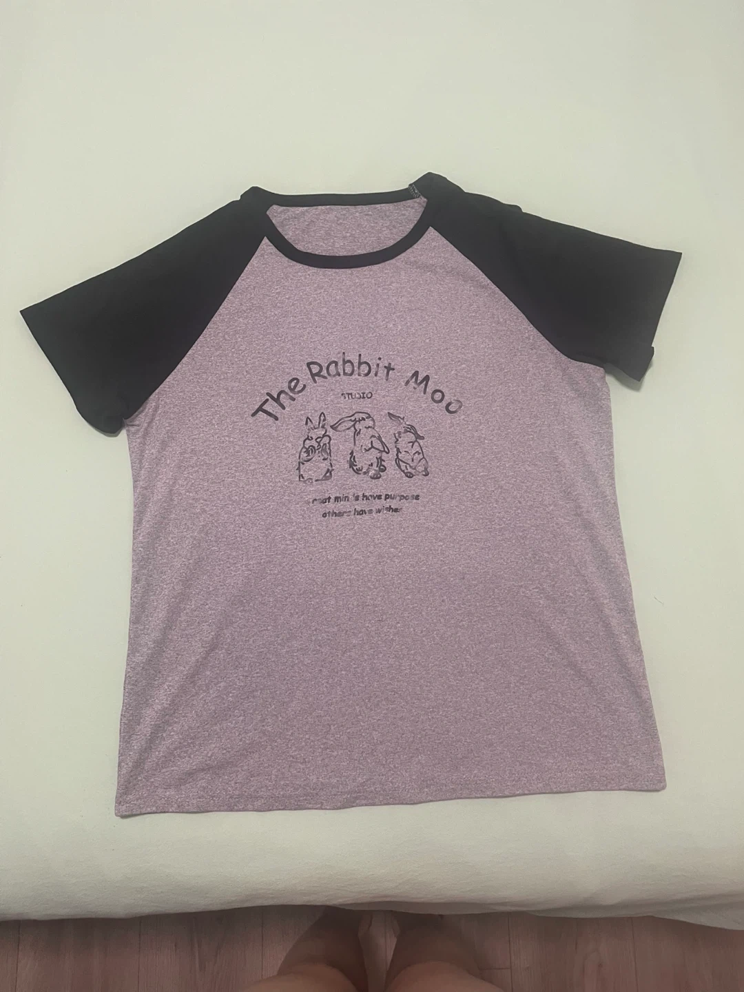 This is a cute T-shirt from The Rabbit Moo Studio! It features a fun design with rabbits and the brand name. The T-shirt has a heathered purple body and black sleeves, making it a stylish and comfortable choice for everyday wear