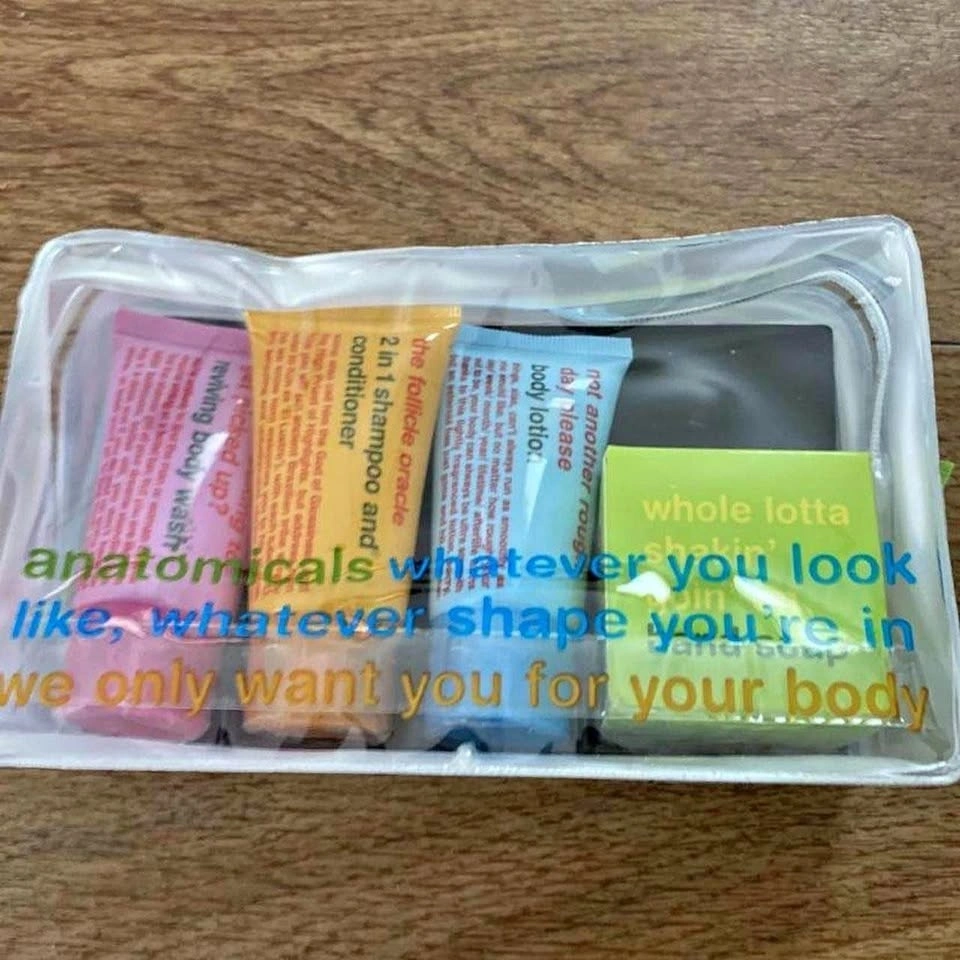 Anatomicals travel wash pouch bag 2 in 1 shampoo and conditioner 30ml body wash 30ml body lotion 30ml and soap 50g.