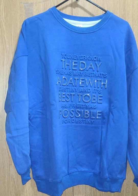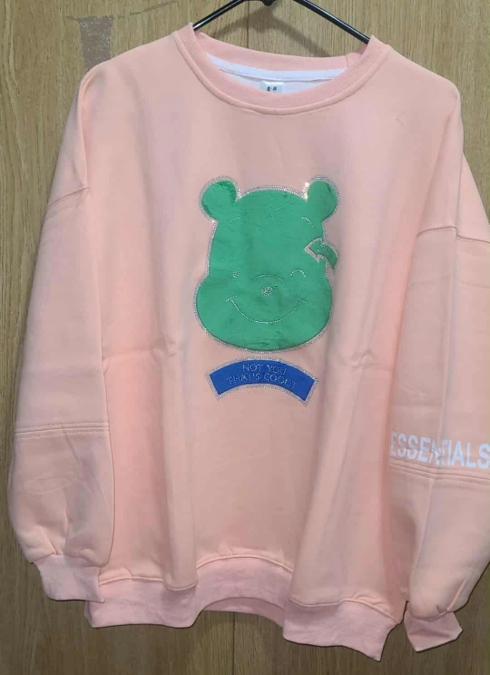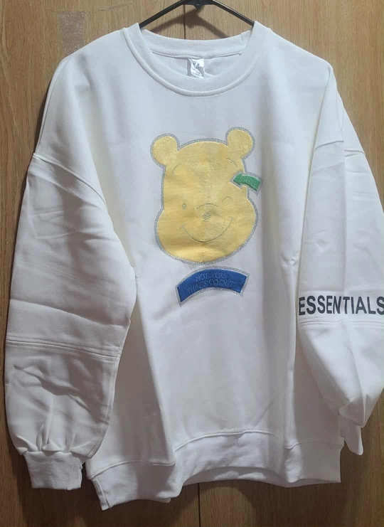 I have a few graphic print sweatshirts up for grabs! There's a blue one with an embossed design, a white one with a Winnie the Pooh graphic, and a peach one with a bear graphic. All brand new