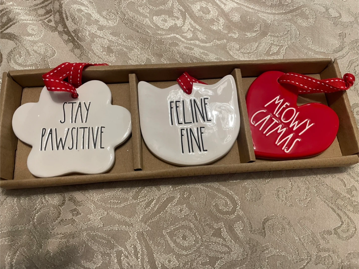 Here's a cute set of Rae Dunn Christmas ornaments for cat lovers! The set includes three ornaments with fun sayings: 'Stay Pawsitive', 'Feline Fine', and 'Meowy Catmas'.