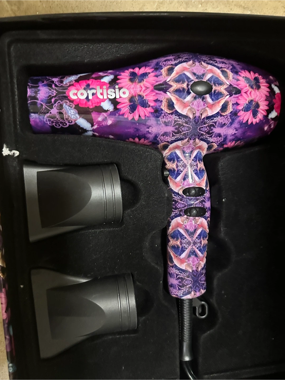 Selling a Cortisio Garden of Eden premium hair dryer! It features ceramic tourmaline coating and ionic technology for shine. It comes with two concentrator nozzles and the original box. Originally bought for $49.99!
