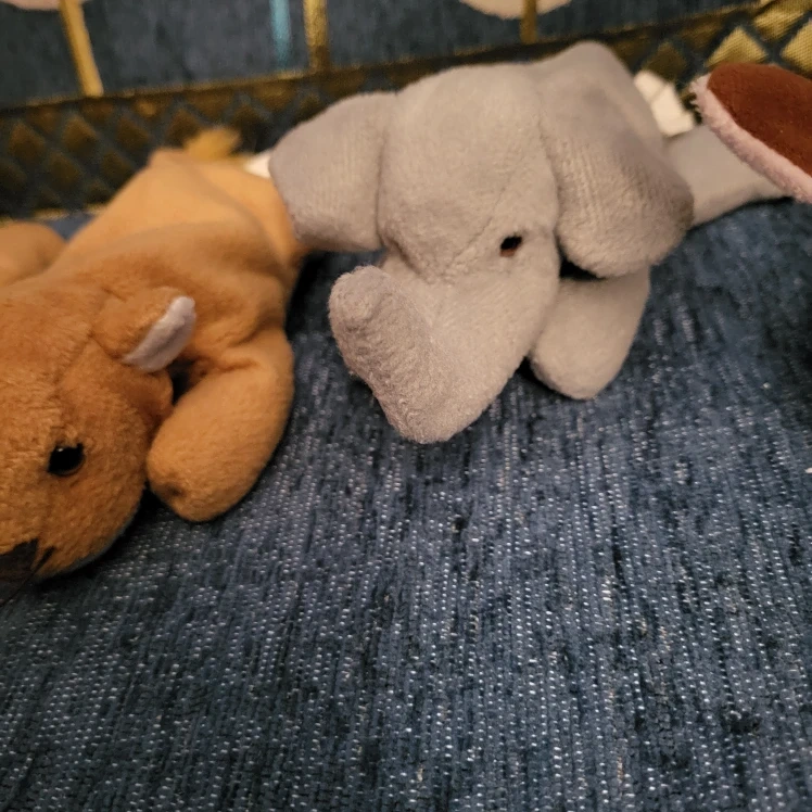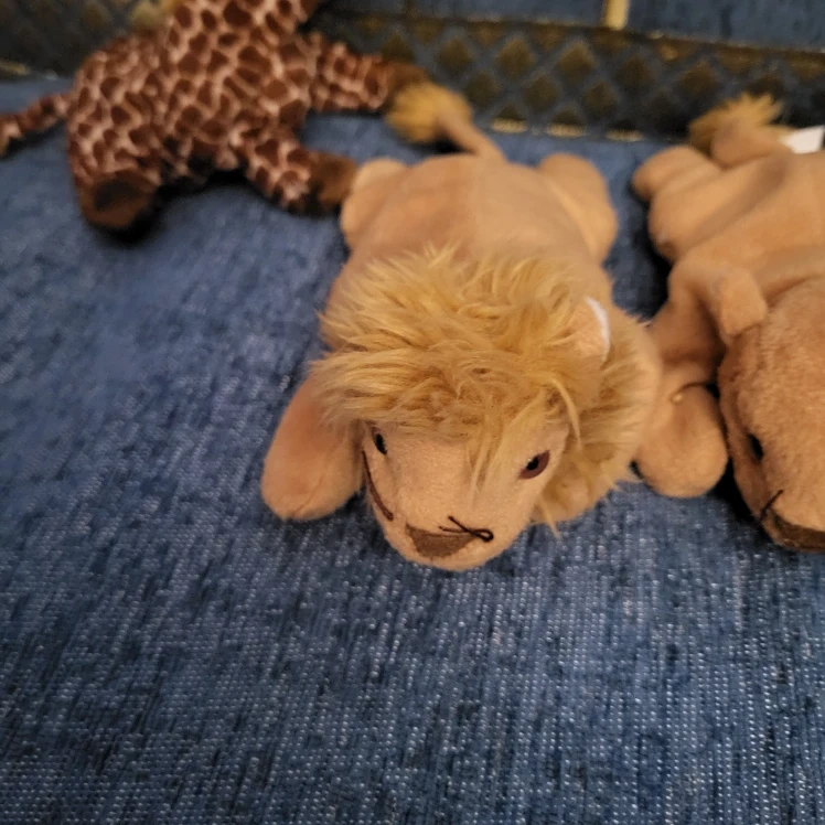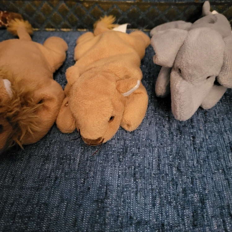 Selling a collection of TY adorable Beanie babies! There's a cute giraffe with brown spots, a cuddly lion, and a sweet elephant, bear and bunny. They're all in great condition and ready for a new home!