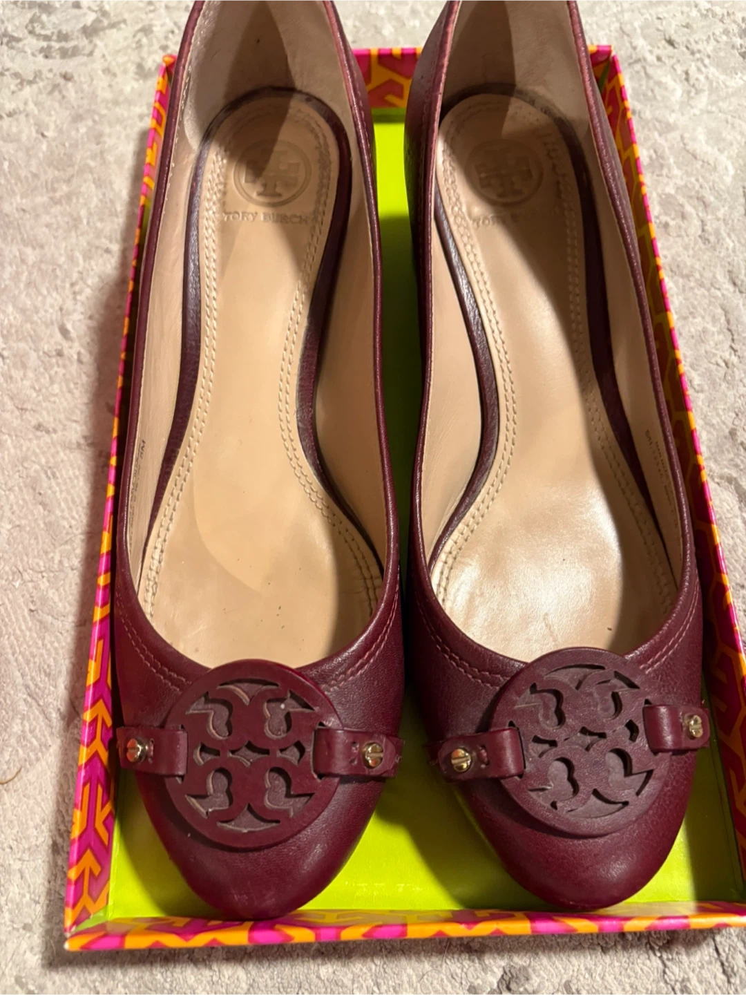 Selling a pair of Tory Burch Mini Miller 45MM pumps in size 8. The colour is Oxblood, and they are made from micro tumbled veg leather. Comes with the original box!