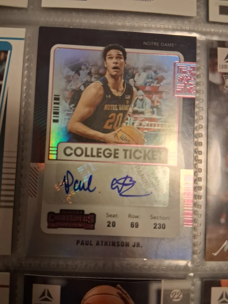 Selling a Paul Atkinson Jr. signed College Ticket card. The card features a signature and details such as seat 20, row 69, and section 230. Great for any Notre Dame fan or card collector!