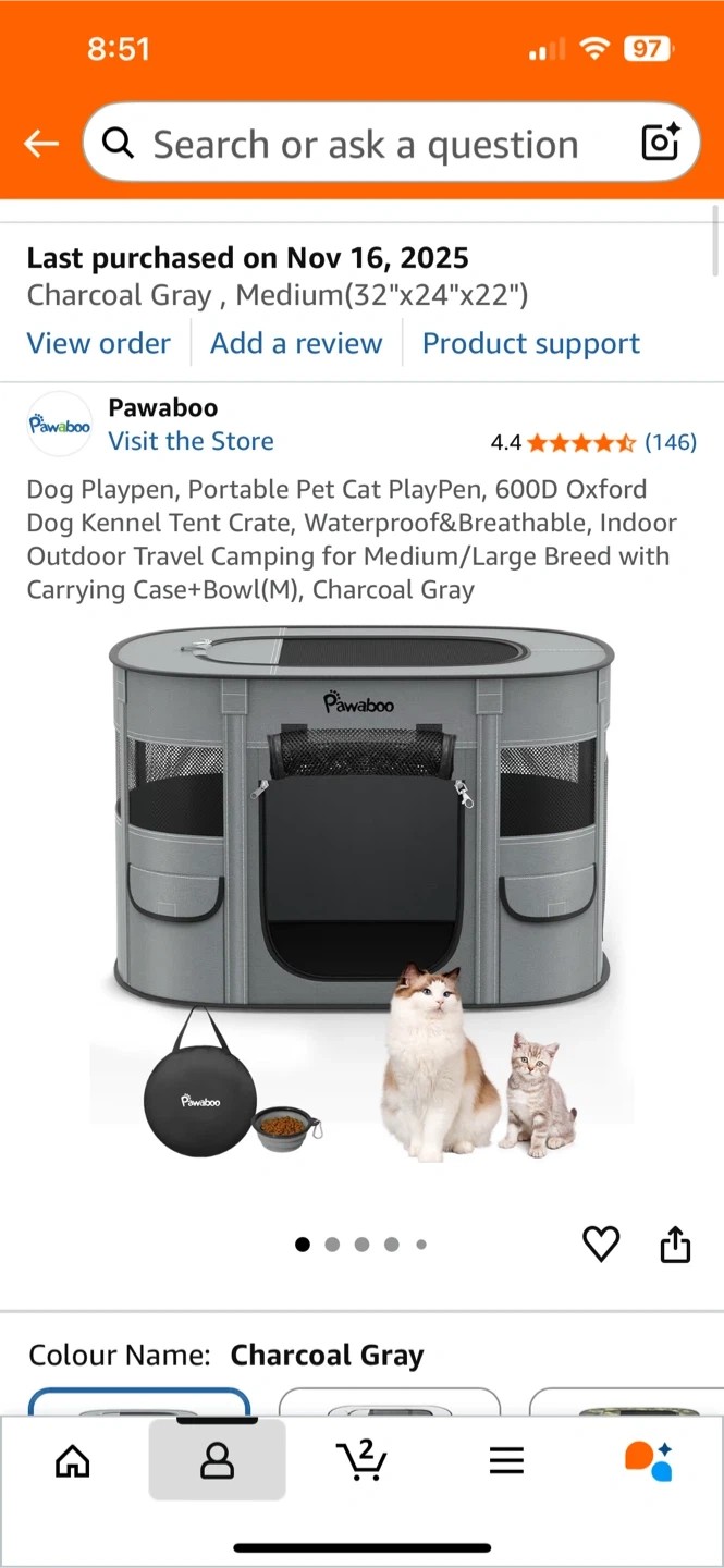 Selling a Pawaboo portable playpen for your furry friends! This is a 600D Oxford dog kennel tent crate, perfect for indoor and outdoor use. It's waterproof and breathable, making it great for travel and camping. Comes with a carrying case and bowl (size M). Colour is charcoal gray. Last purchased on 2025 November 16.