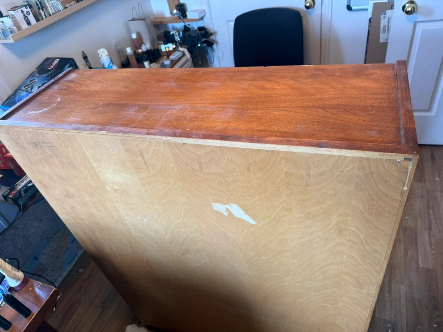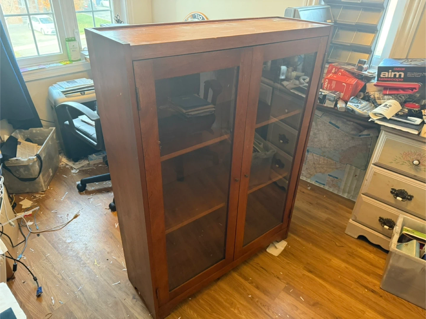 This is an oak wooden display cabinet with glass doors! It's perfect for displaying books or other items. It's in good condition.