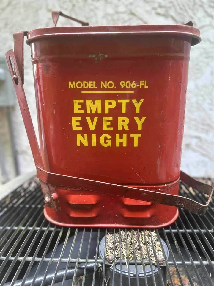 Authentic metal safety fire can with original red paint and bold yellow lettering: “EMPTY EVERY NIGHT.” A perfect statement piece for industrial, loft, or farmhouse décor.