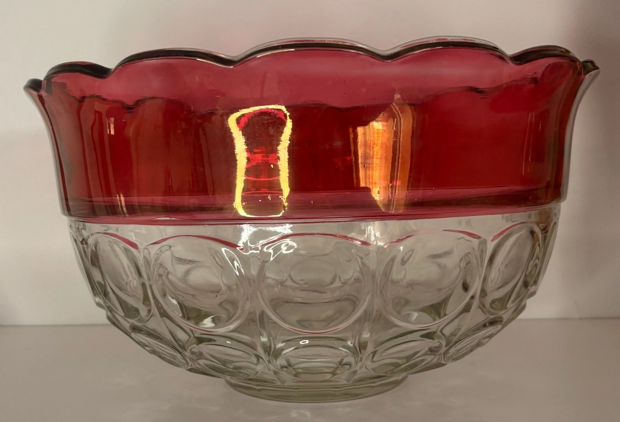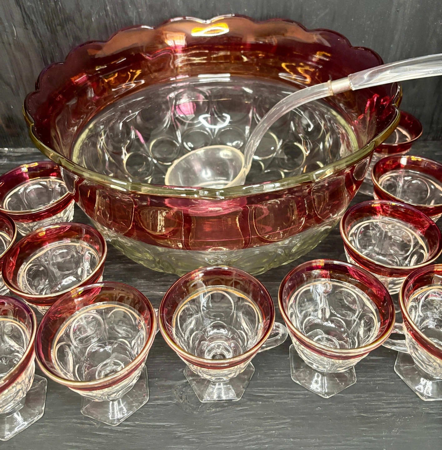Celebrate any special occasion or gathering with style and class with this stunning Indiana Glass Ruby Red Glass Punch Bowl Set. Known for its brilliant ruby red hue and classic American glassmaking craftsmanship, this set is the centerpiece of any gathering. Perfect for holidays, weddings, anniversaries, or elegant dinner parties, it brings sophistication and charm to your table.