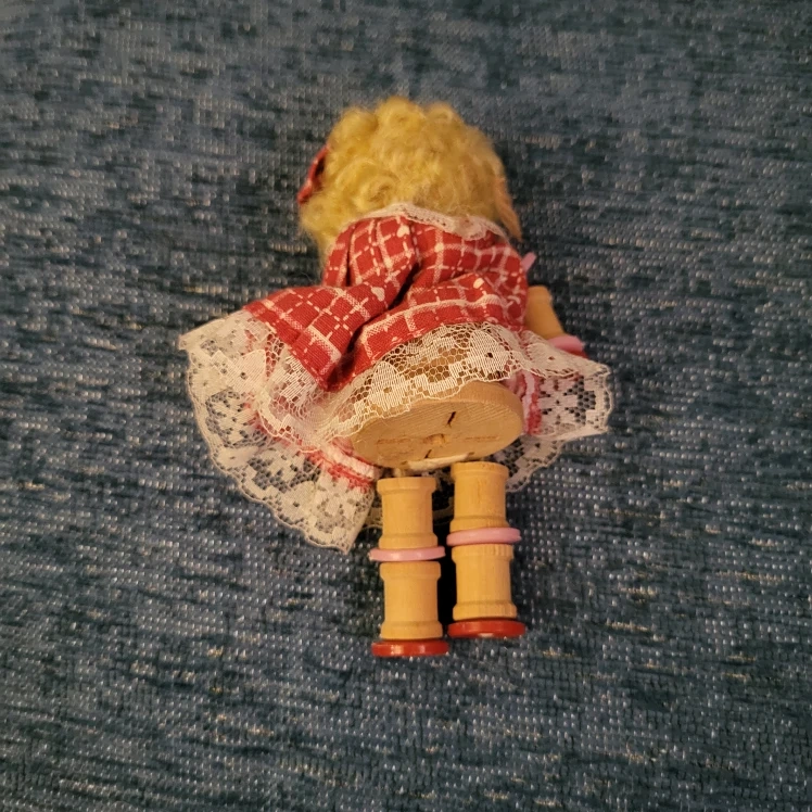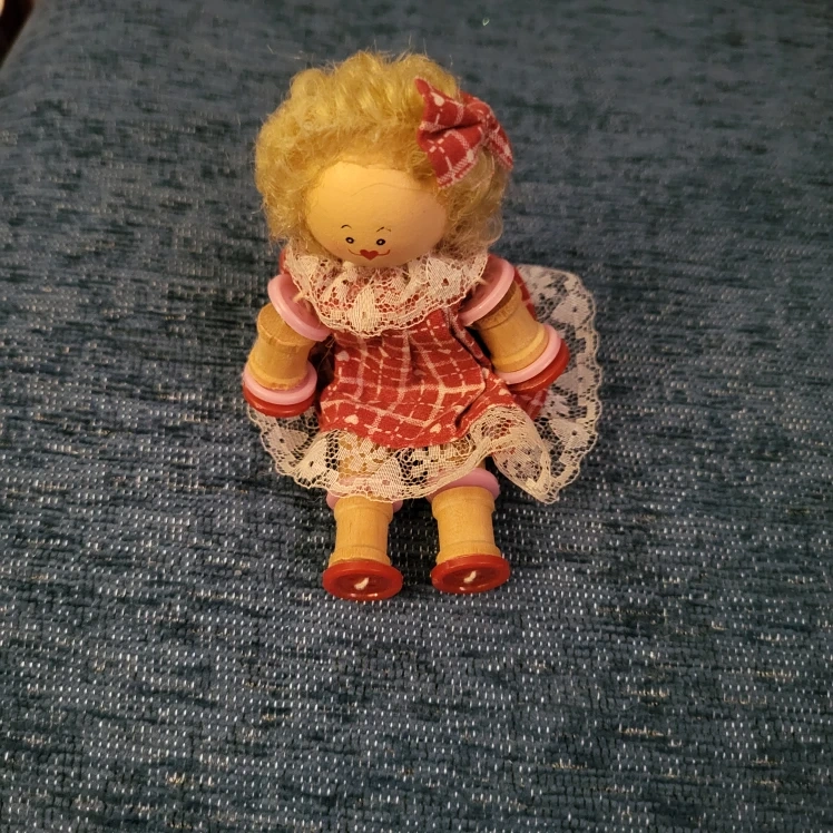 This is a cute, handmade wooden doll with a red and white checkered dress and lace trim. It would make a lovely addition to any doll collection or a sweet gift for a child.