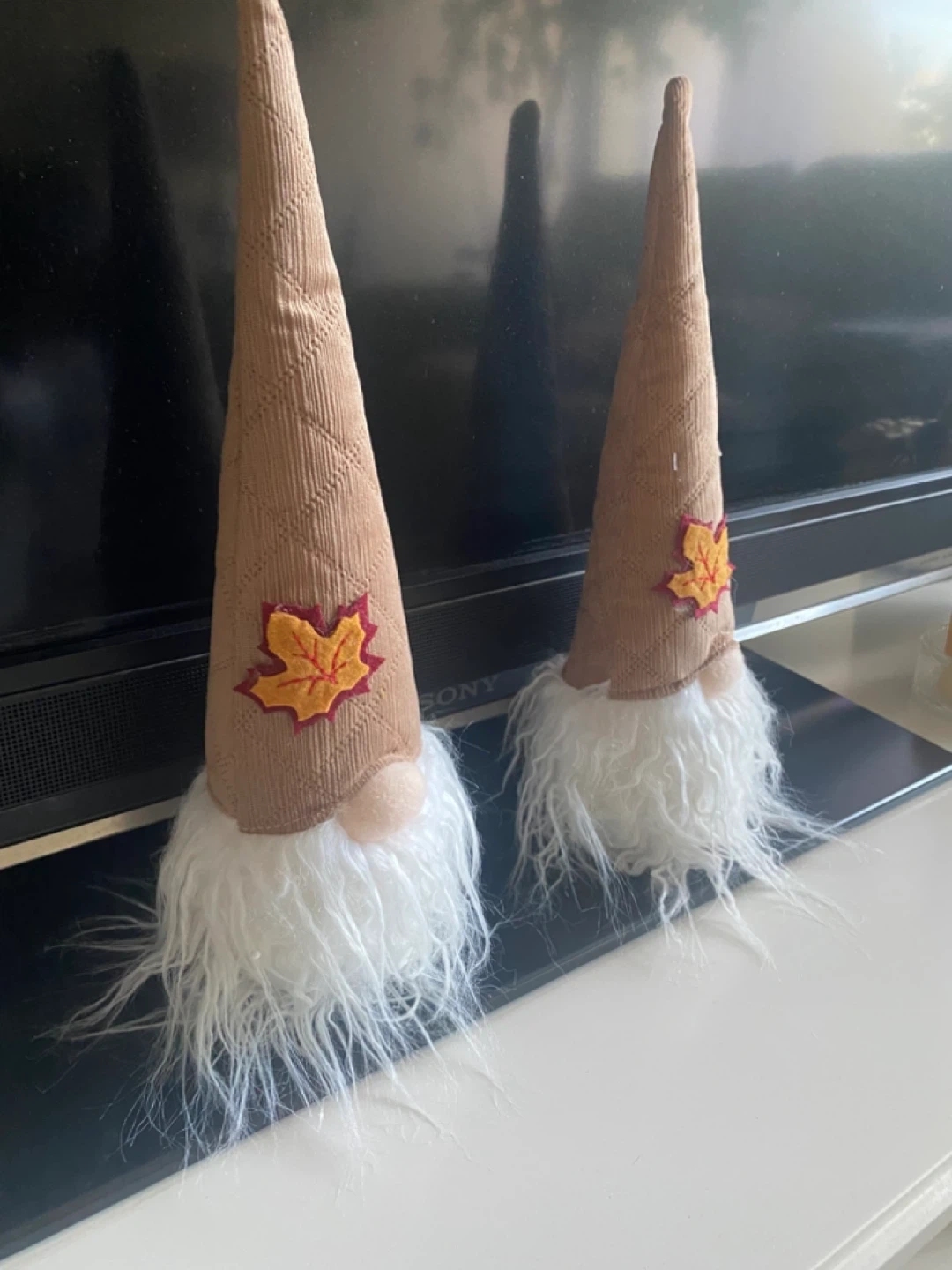 Selling a set of two adorable fall-themed gnomes! They have a cute maple leaf design and would be perfect for decorating your home for the autumn season