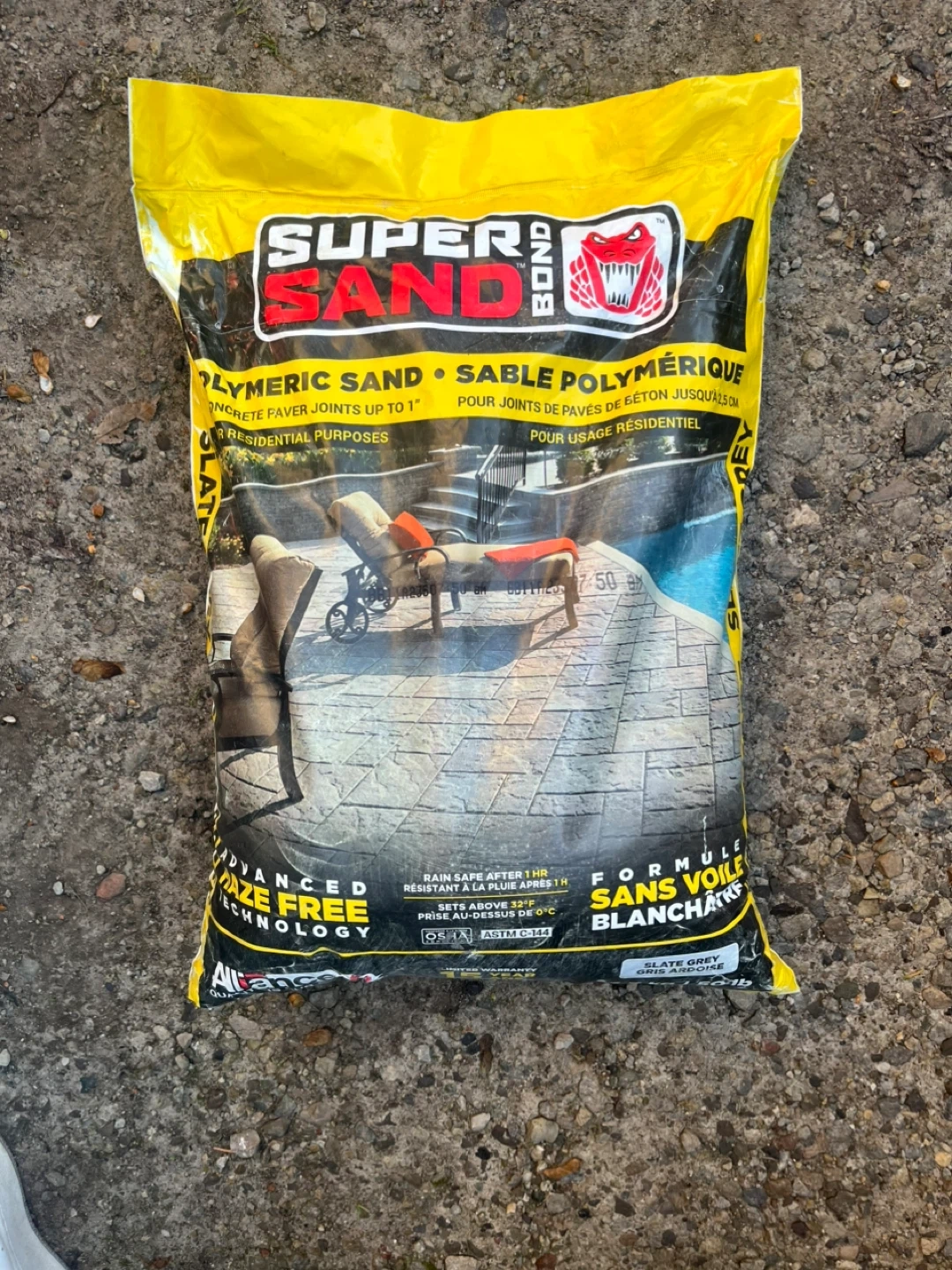 Selling 3 bags of Super Sand Bond Polymeric Sand $20 each or $50 for all. It's designed for concrete paver joints up to 1" for residential purposes. The advanced haze-free technology ensures a clean finish. Rain safe after 1 hour and sets above 32°F.