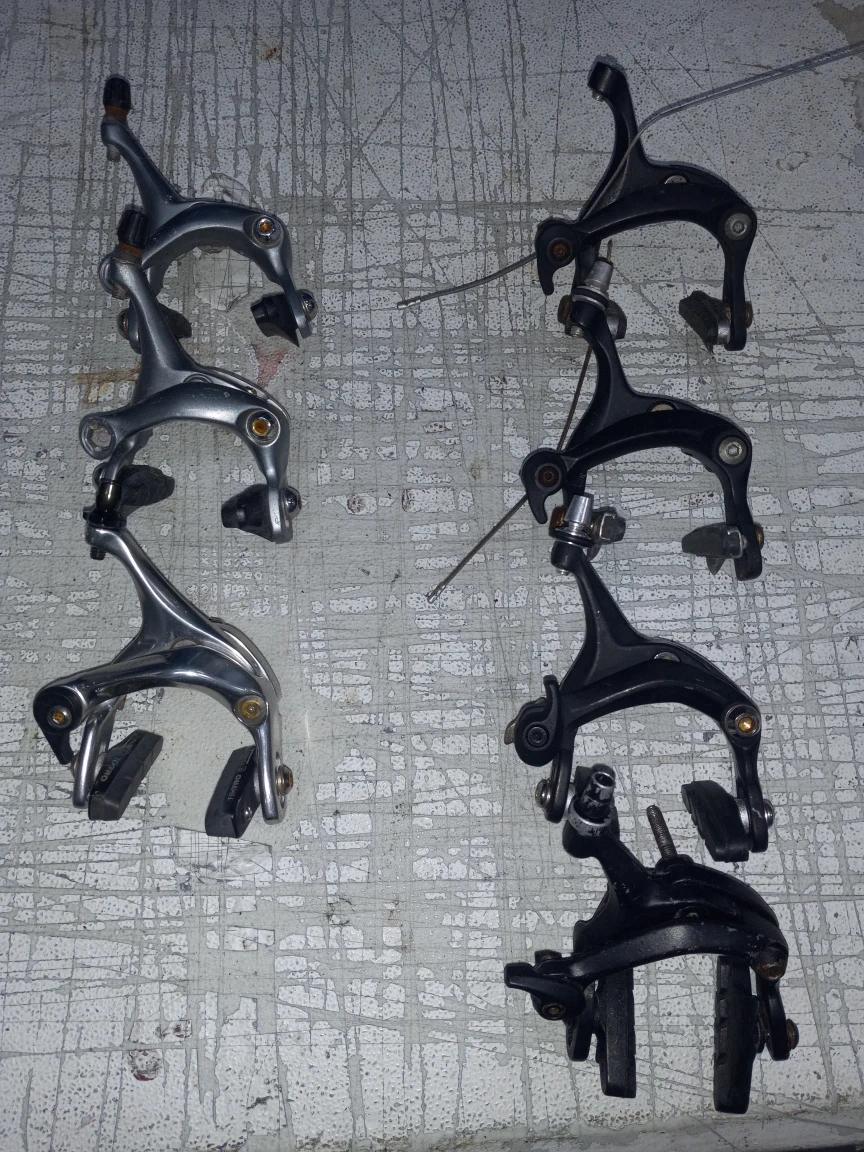 Selling a set of vintage bicycle brakes. One pair is silver, and the other is black. They appear to be in good condition for their age. Perfect for a restoration project or to keep as spares!. Great for your bike stopping power $15each $10 bulk