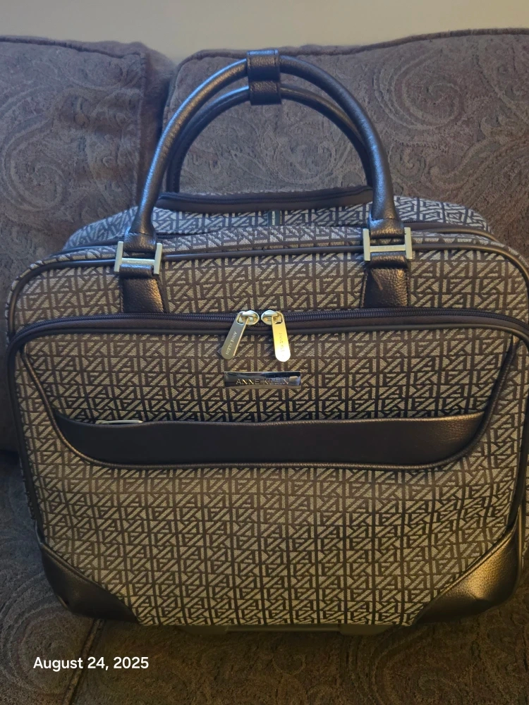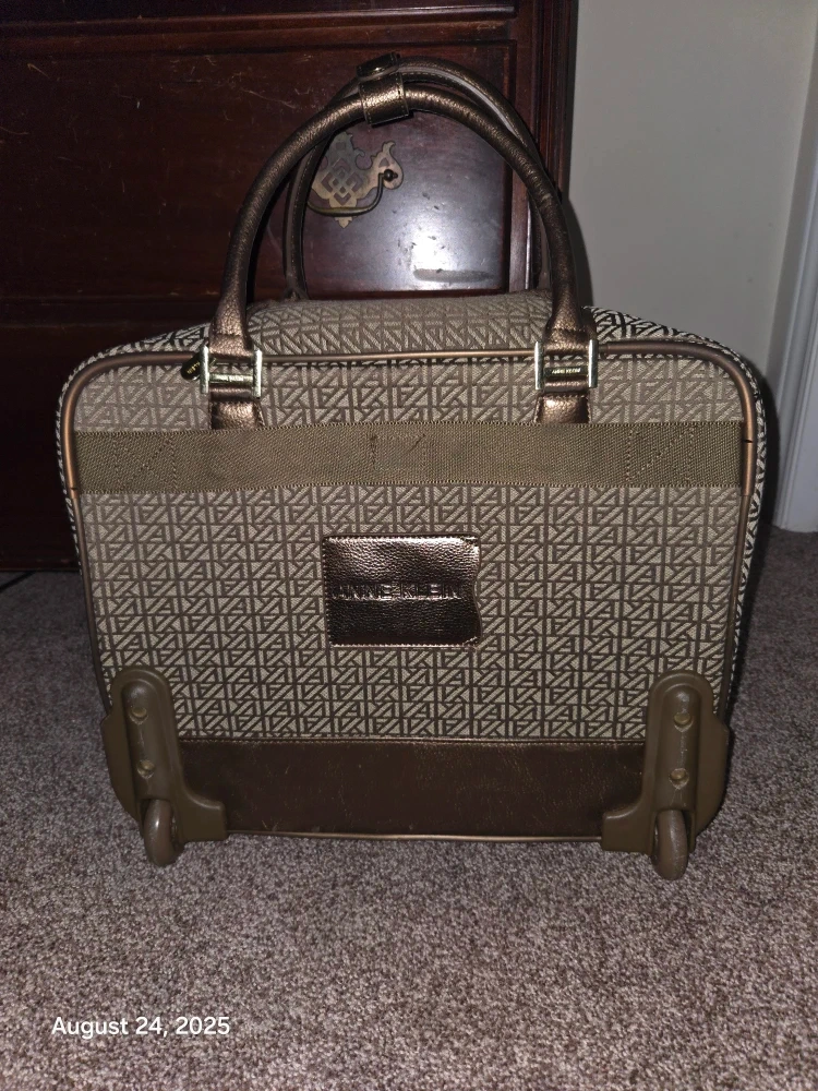 Authentic Anne Klein rolling bag in perfect condition. This weatherproof travel bag has 4 compartments, two wheels and a retractable handle. It is airline approved as carryon baggage. Pickup and cash only, St Catharines