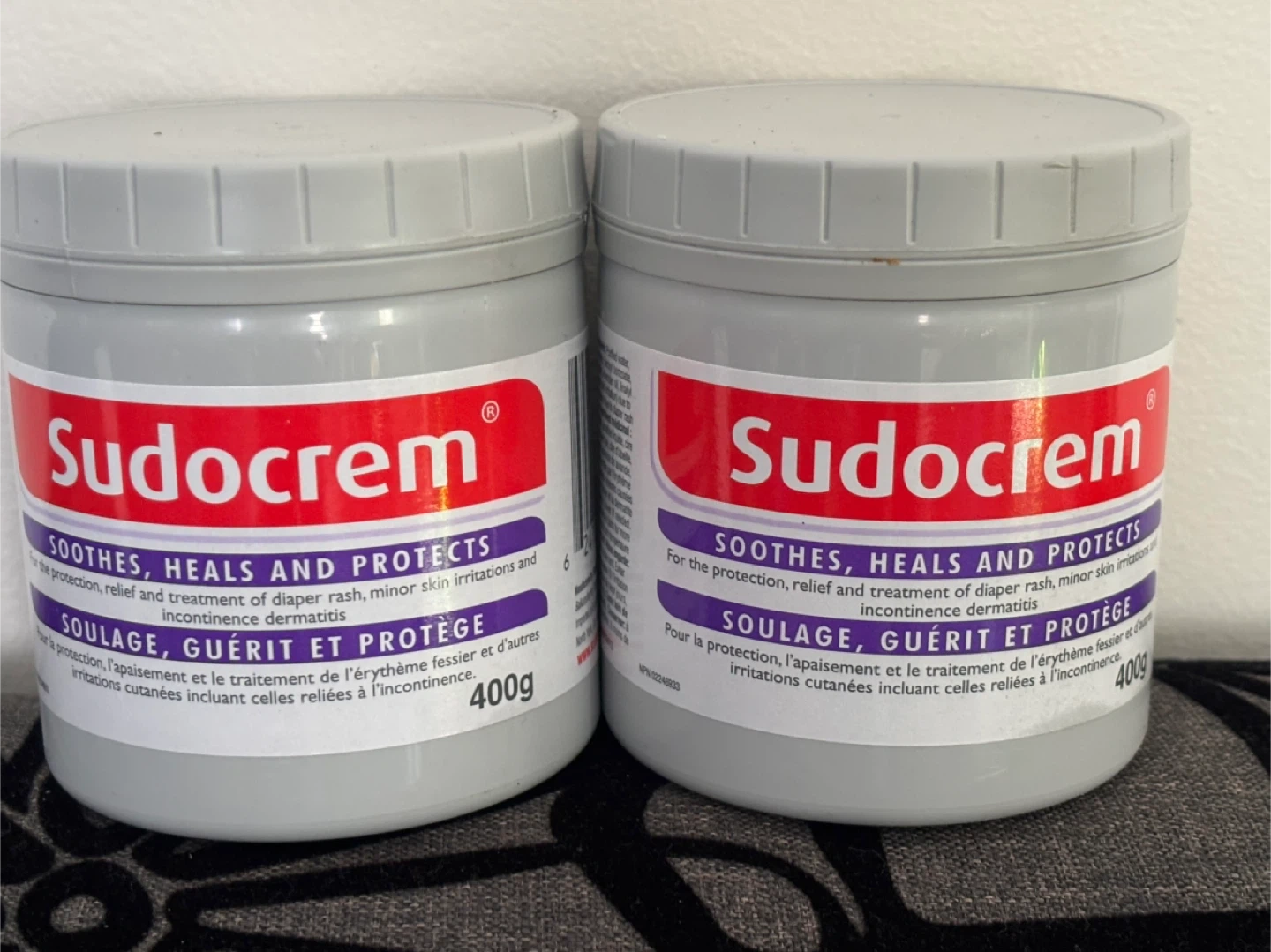 Selling two tubs of Sudocrem Antiseptic Healing Cream, each containing 400g. This cream soothes, heals, and protects, providing relief and treatment of diaper rash and minor skin irritations. Expiry date is September 2027.