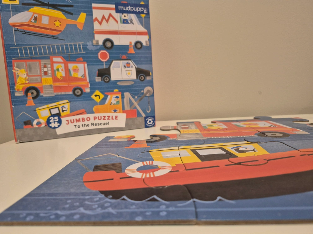 This is a Mudpuppy Jumbo Puzzle, titled "To the Rescue!" It's a 25-piece puzzle, perfect for little ones. The box is included!