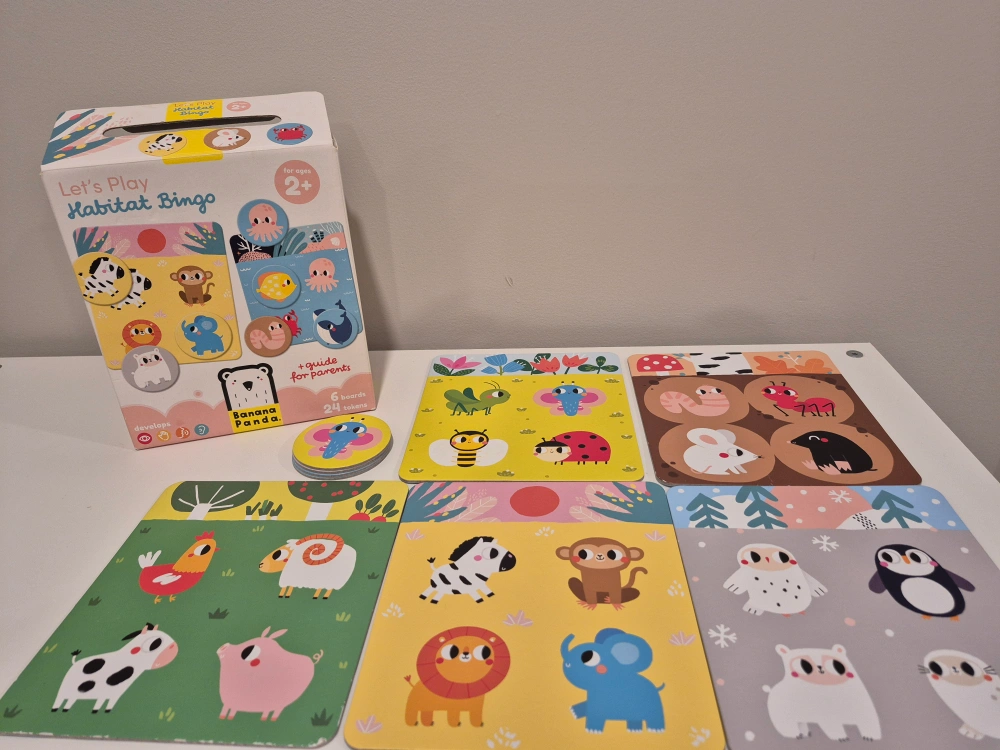 Selling a Banana Panda Let's Play Habitat Bingo game! It's in like-new condition and comes with the original box. This game is designed for ages 2 and up. It includes 6 boards and 24 tokens, perfect for developing hand-eye coordination and memory.