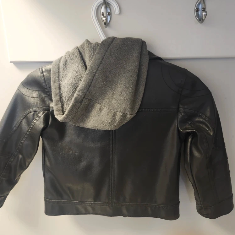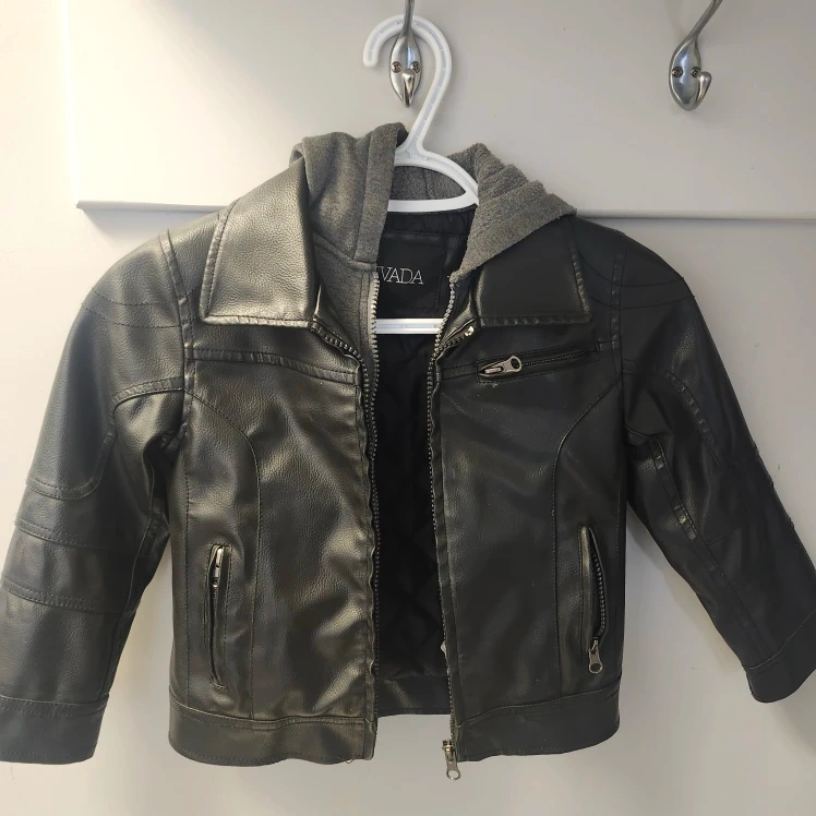 A stylish black faux leather size 4T jacket for kids from Nevada! It features a hood and zipper. Perfect for keeping your little one warm and fashionable.