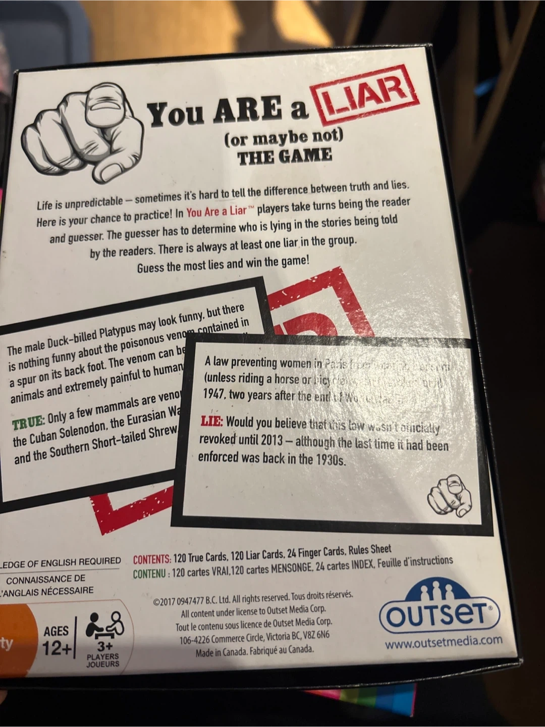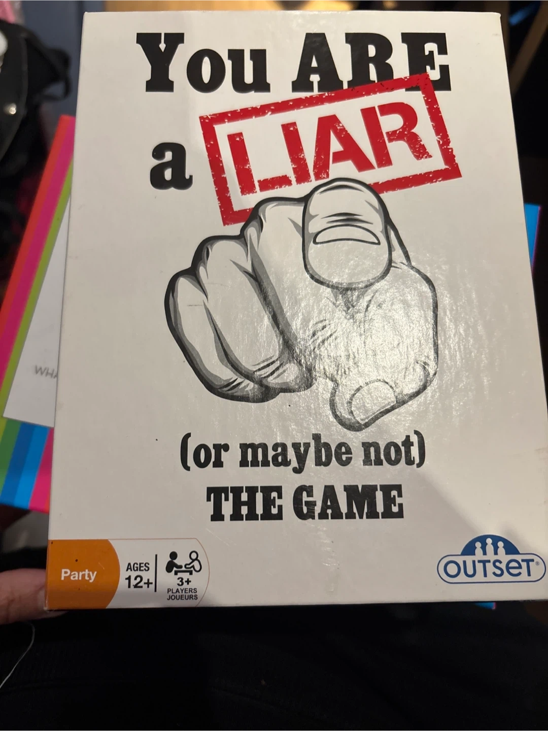 You Are a Liar (or maybe not) The Game by Outset is a fun party game for ages 12+. It includes 120 true cards, 120 liar cards, 24 finger cards, and a rules sheet. Guess the most lies and win!