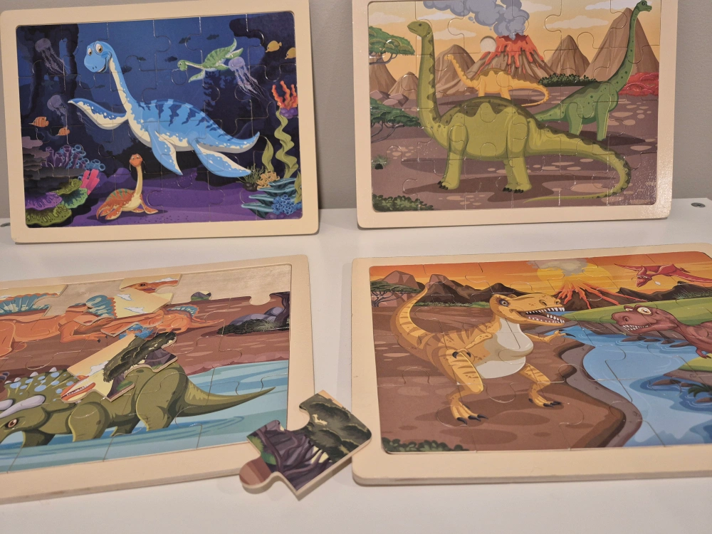 Selling a set of four adorable dinosaur-themed wooden puzzles! They're in great shape and perfect for young children who love dinosaurs and puzzles. Each puzzle features a different dinosaur scene, making it a fun and educational activity