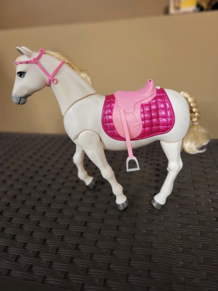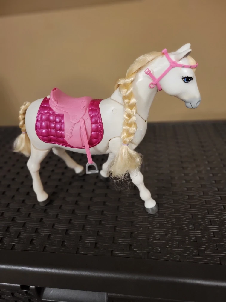 Selling a Barbie horse toy! It's white with a cute pink saddle and bridle. Perfect for any Barbie fan or collector. In great condition and ready for a new home!
