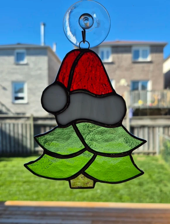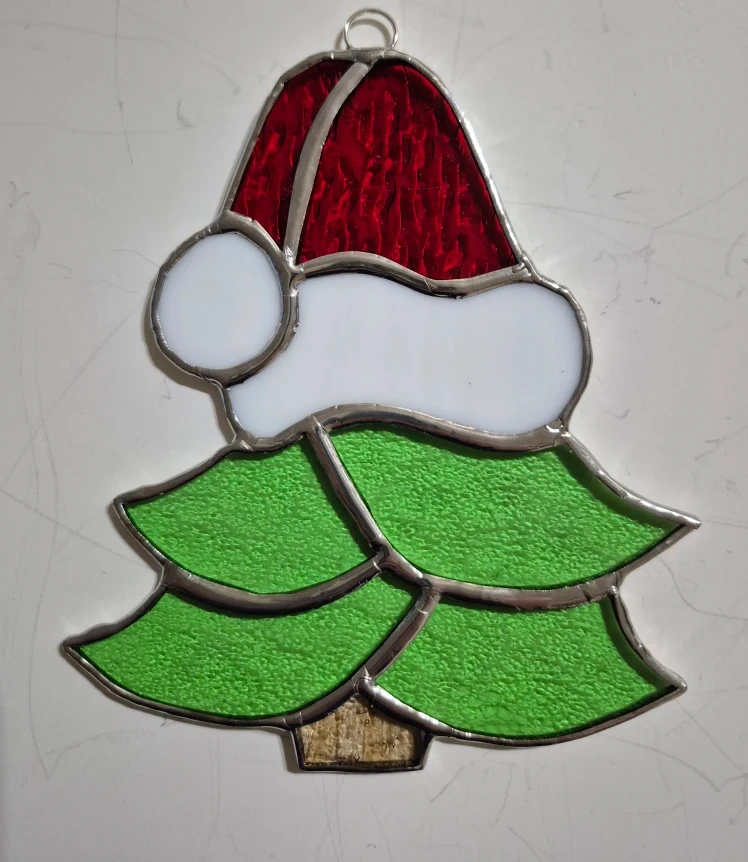 Christmas red hat, bright green tree. Approx size 4.5 by 5.5 inches. Could also be used as a suncatcher.