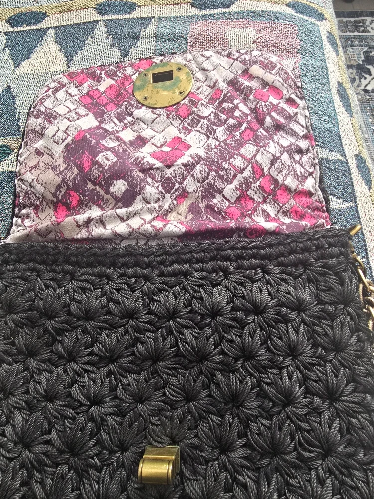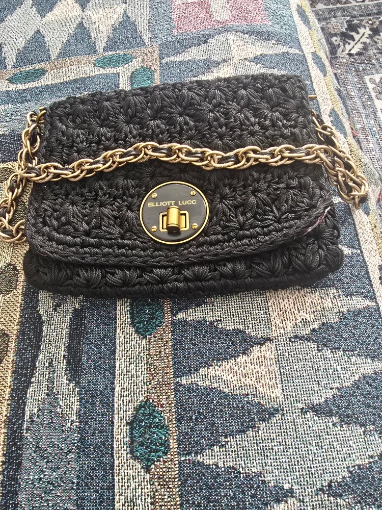 Selling a stylish Elliott Lucca black crochet bag with a chain strap! It's in great condition and ready for a new home. The intricate crochet design and chain detail add a touch of elegance to any outfit.