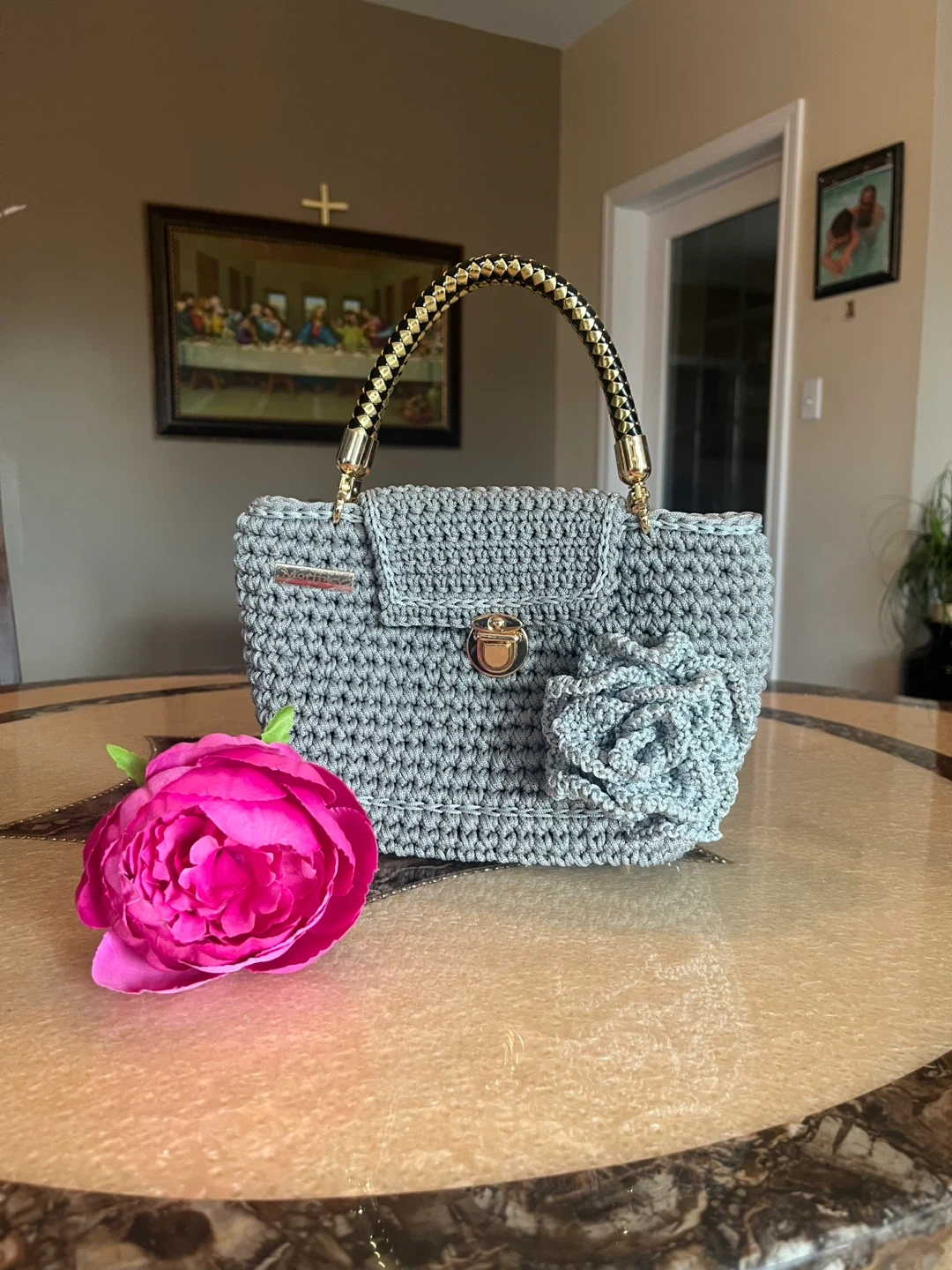 Selling a lovely handmade crochet bag in a beautiful grey colour. It's in great condition and has a unique, handcrafted feel. Perfect for adding a touch of charm to any outfit!