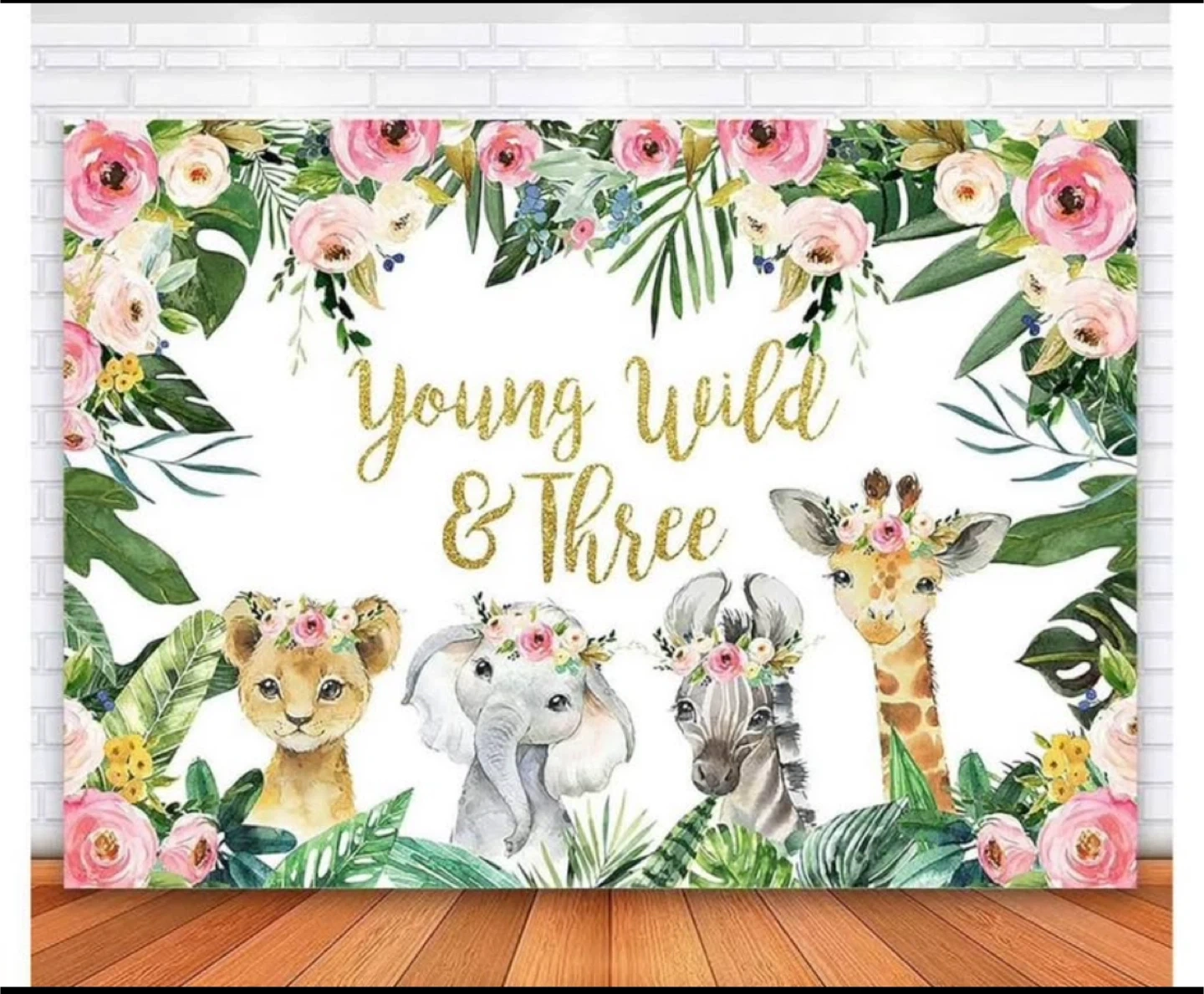 This is a cute backdrop with a 'Young Wild & Three' theme, featuring jungle animals and floral accents. Perfect for a third birthday party or photoshoot