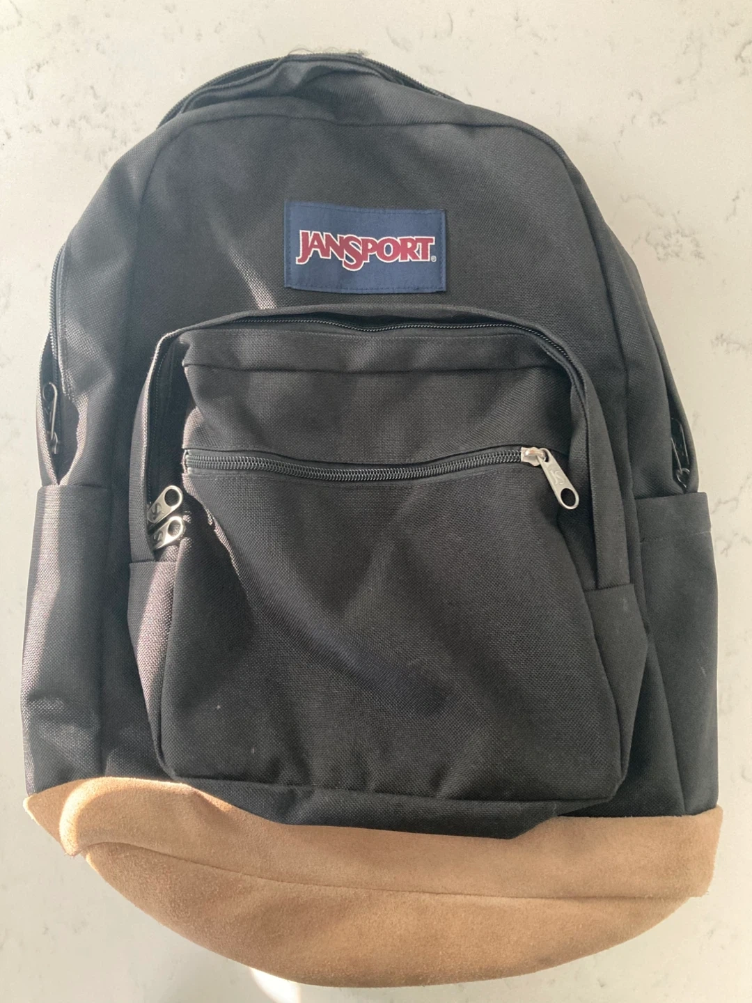 Here's a JanSport Right Pack backpack in a classic black and brown colour combo! It's made with a durable fabric and has a suede leather bottom. Perfect for any occasion.