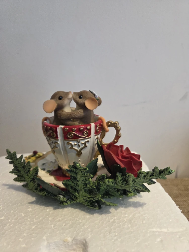 This is a charming 'Love Suits Us To A Tea' figurine by Fitz and Floyd. It features two adorable mice in a teacup, surrounded by floral accents. The item comes with its original box, and it was originally priced at $24.99. It's a delightful piece for collectors or anyone who appreciates whimsical decor!