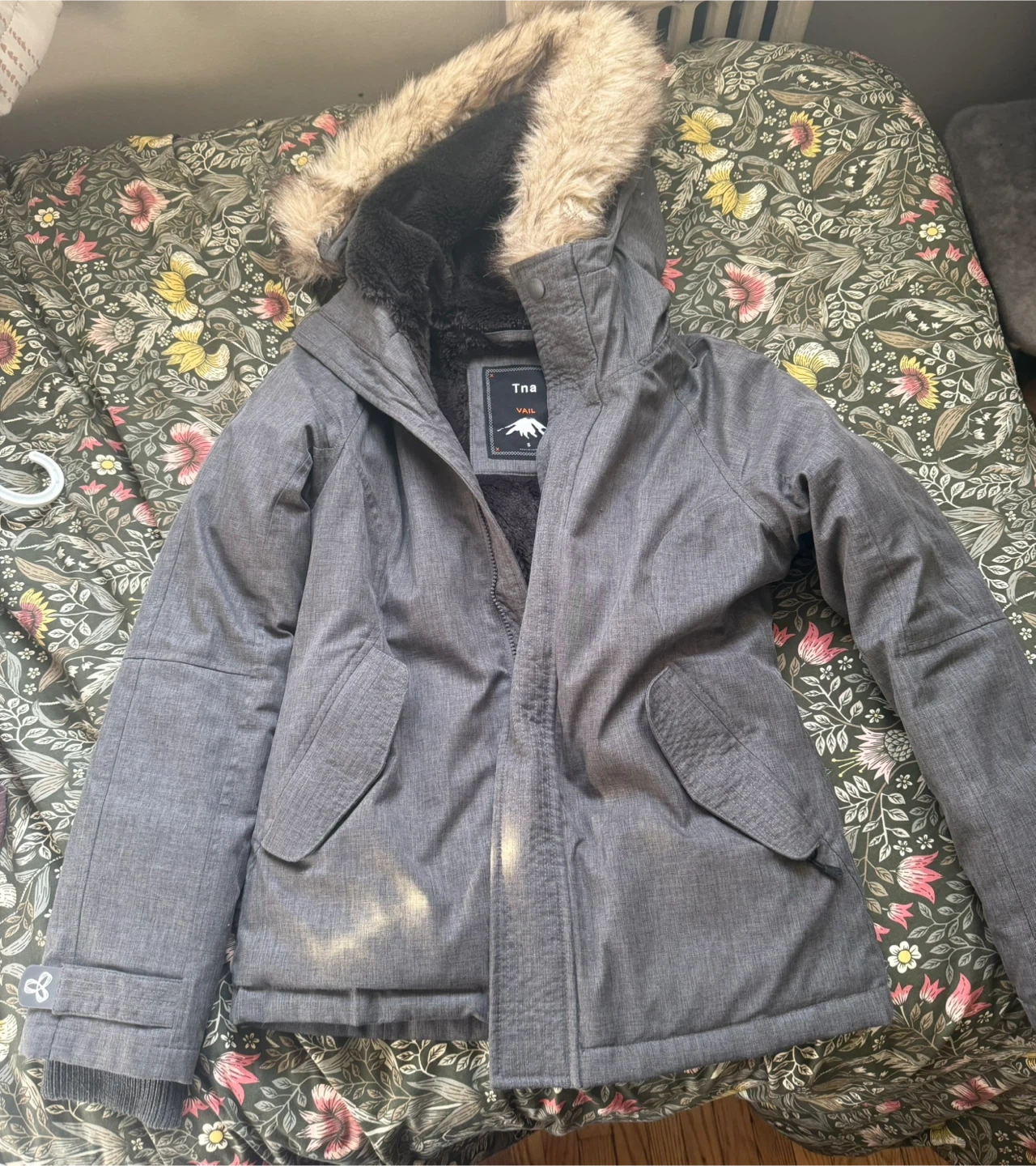 Selling a Tna jacket in grey. It's a size small. It's in great condition and ready for the cold weather!