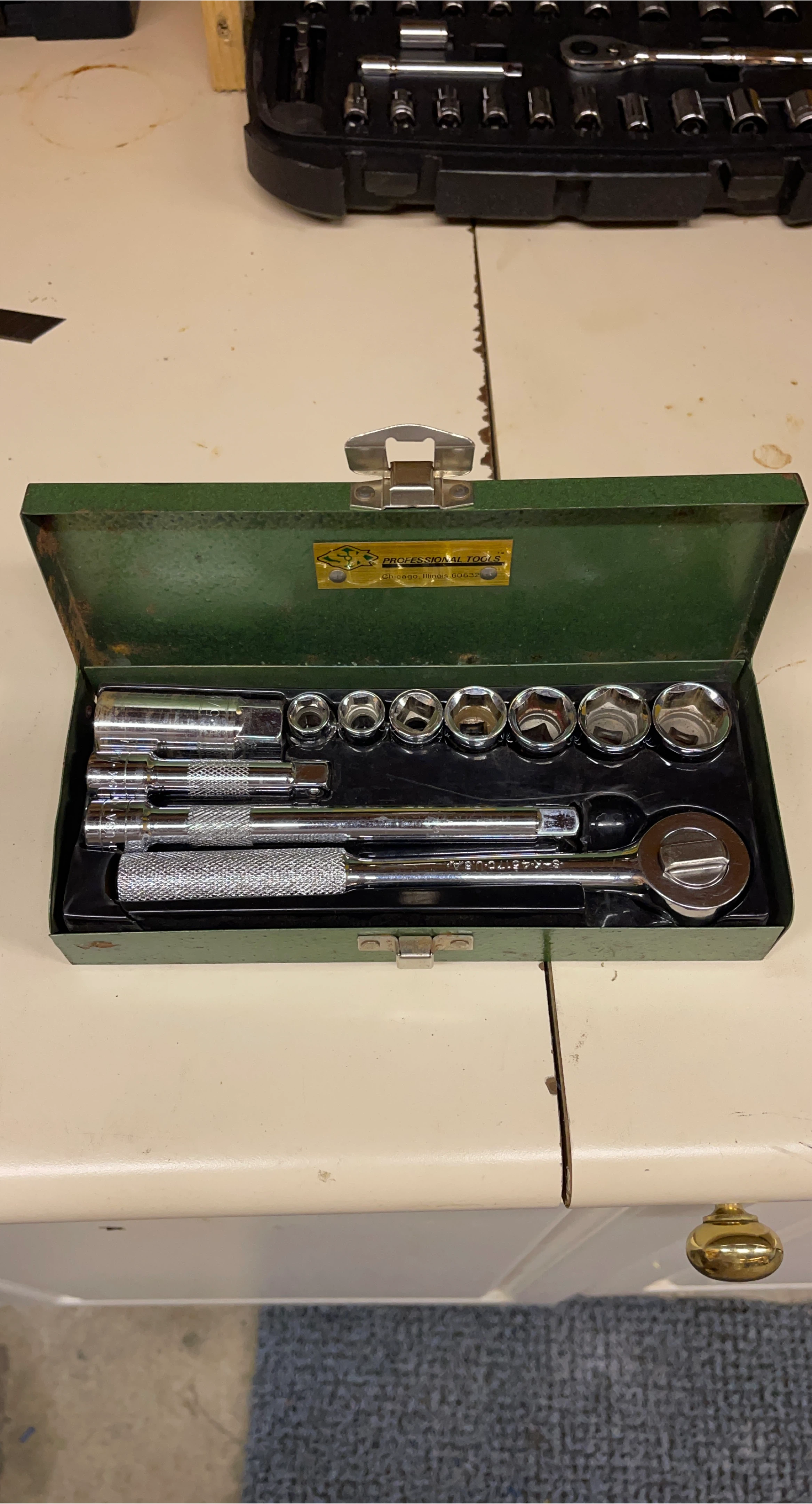 Selling a vintage SK Professional Tools socket set. It comes in its original green metal case and includes a variety of sockets and ratchets. A great addition to any tool collection!