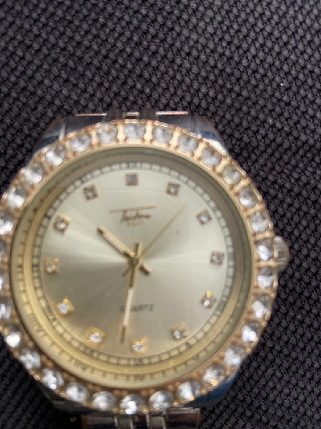 Selling a women's Technos Quartz watch. It has a silver and gold-tone design with decorative stones around the face. The watch has some wear and tear.