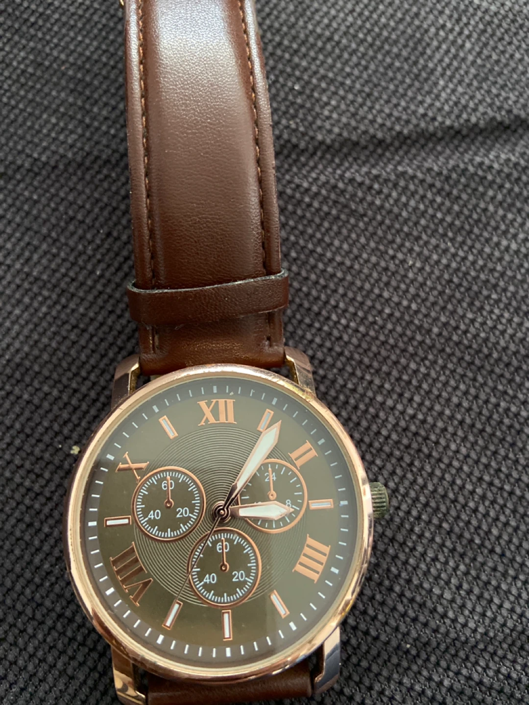 Classic Accutime watch with a brown leather strap. The watch face features Roman numerals and chronograph subdials. A stylish accessory for any occasion!