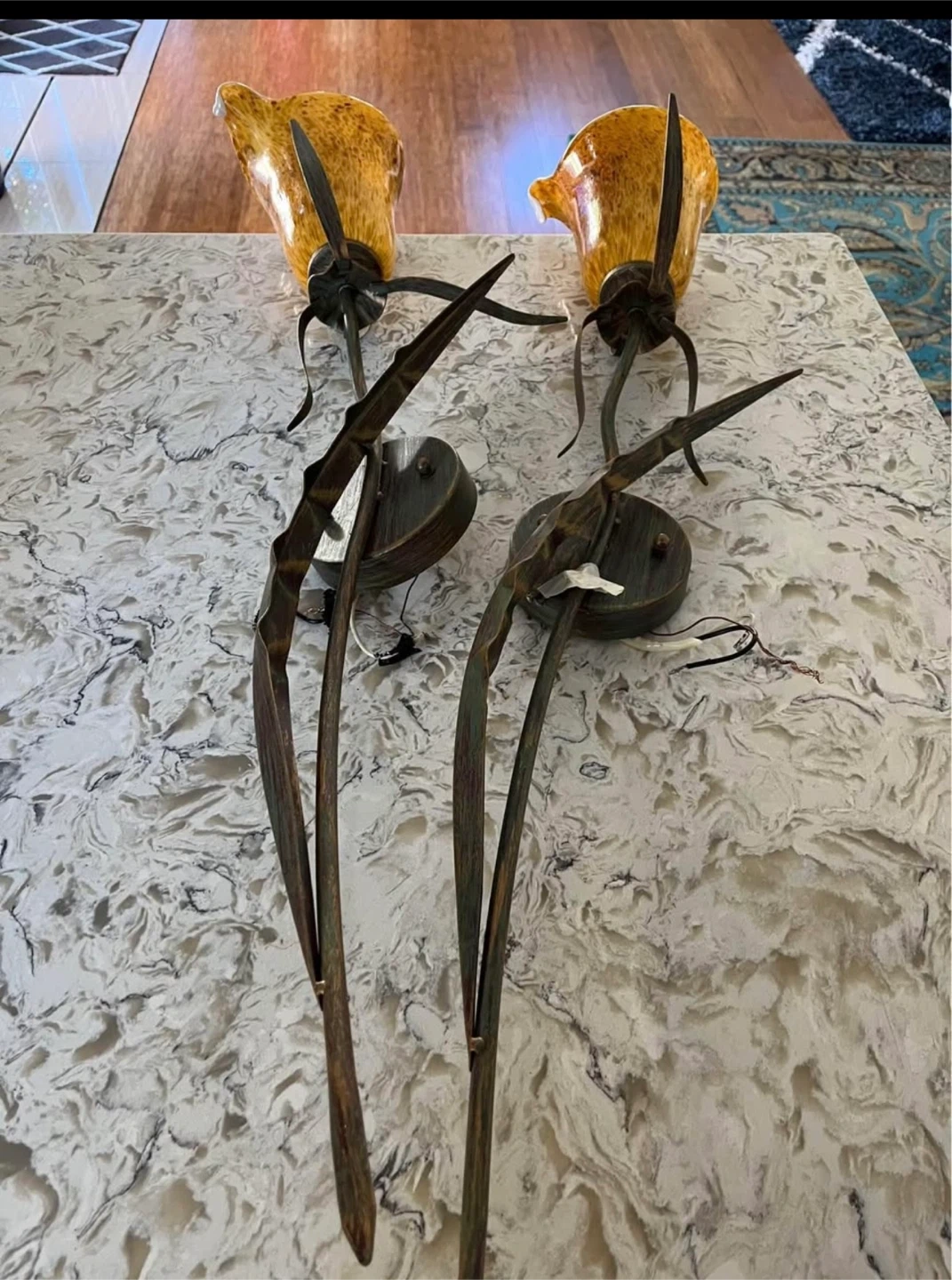 Selling a set of two unique wall sconce lighting fixtures. They feature a beautiful amber-colored glass shade with a speckled design and a rustic metal base. These sconces would add a touch of elegance and warmth to any room. They're in great condition and ready to brighten up your space