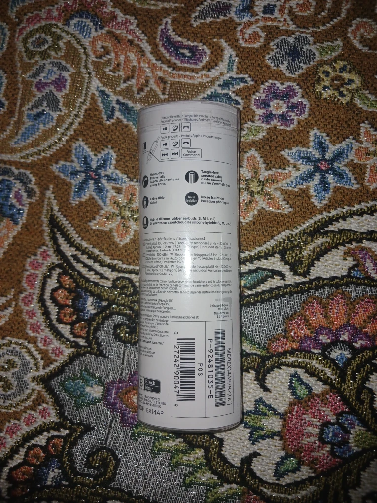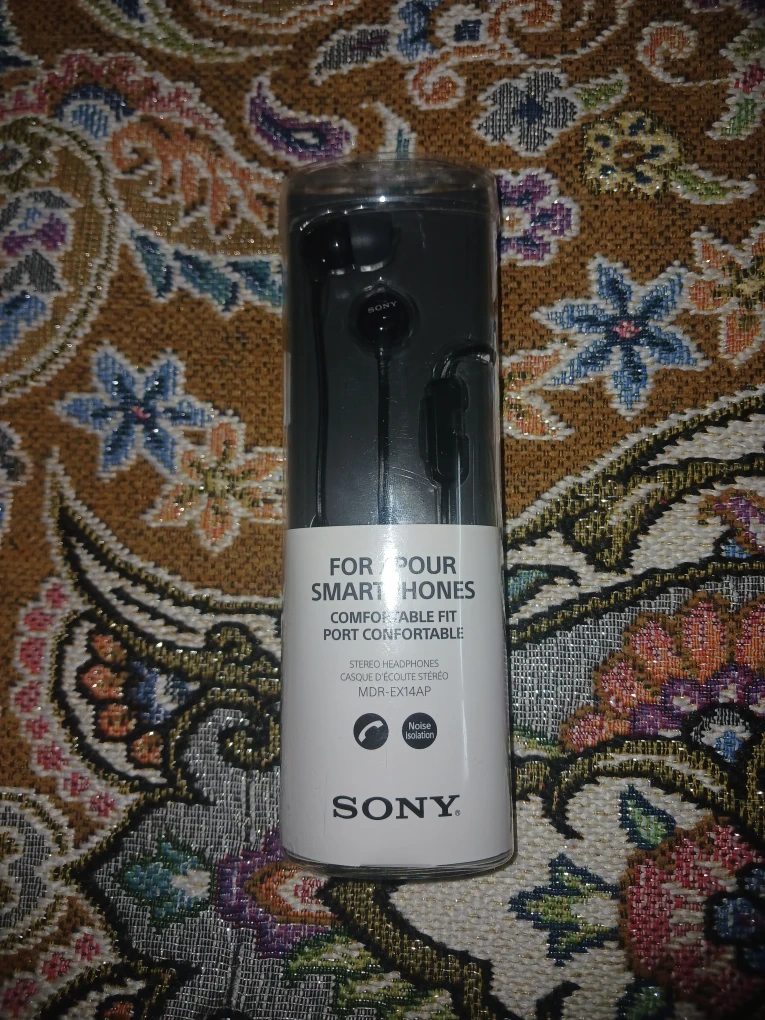 Selling a pair of Sony stereo headphones, model MDR-EX14AP, in black. These are designed for smartphones, offering a comfortable fit and are easy to carry around. They feature hybrid silicone rubber earbuds in sizes S, M, and L for optimal noise isolation. Plus, they come with a cable slider to prevent tangles and are compatible with Apple products. The original box is included!