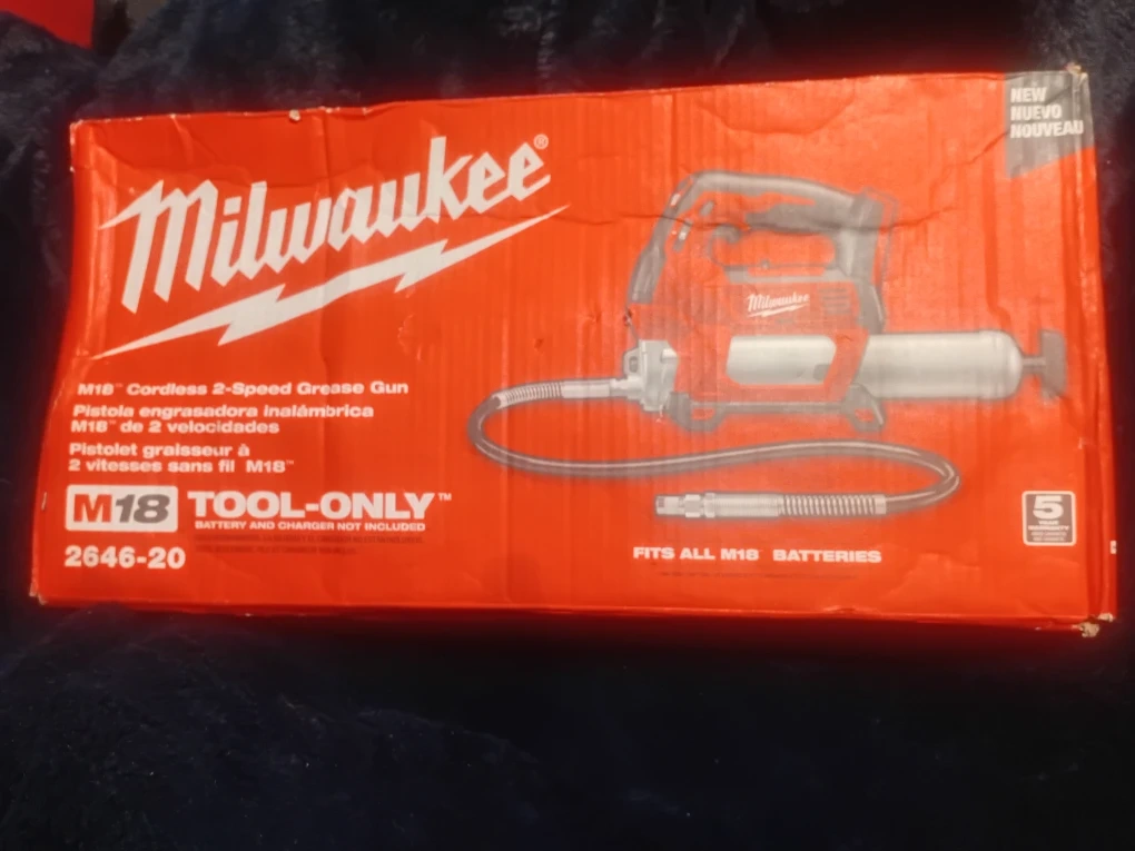 Selling a Milwaukee M18 Cordless 2-Speed Grease Gun, model 2646-20. It's a tool-only unit, meaning the battery and charger are not included. It fits all M18 batteries. Comes with the original box