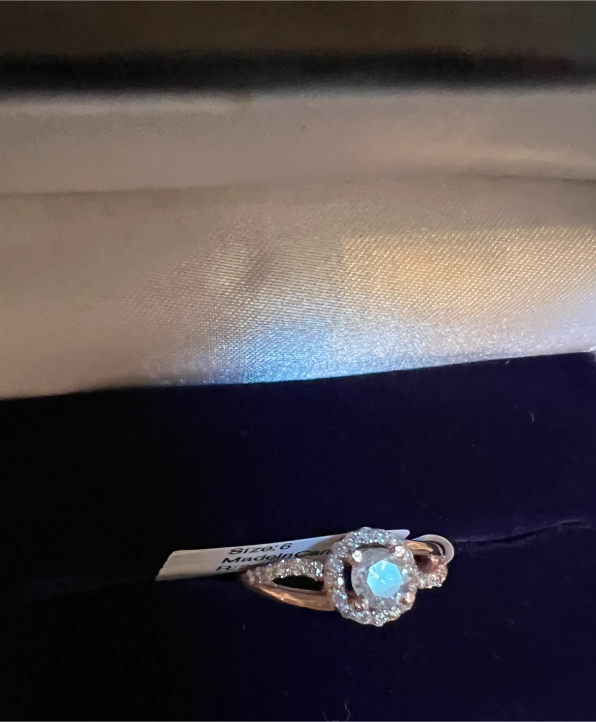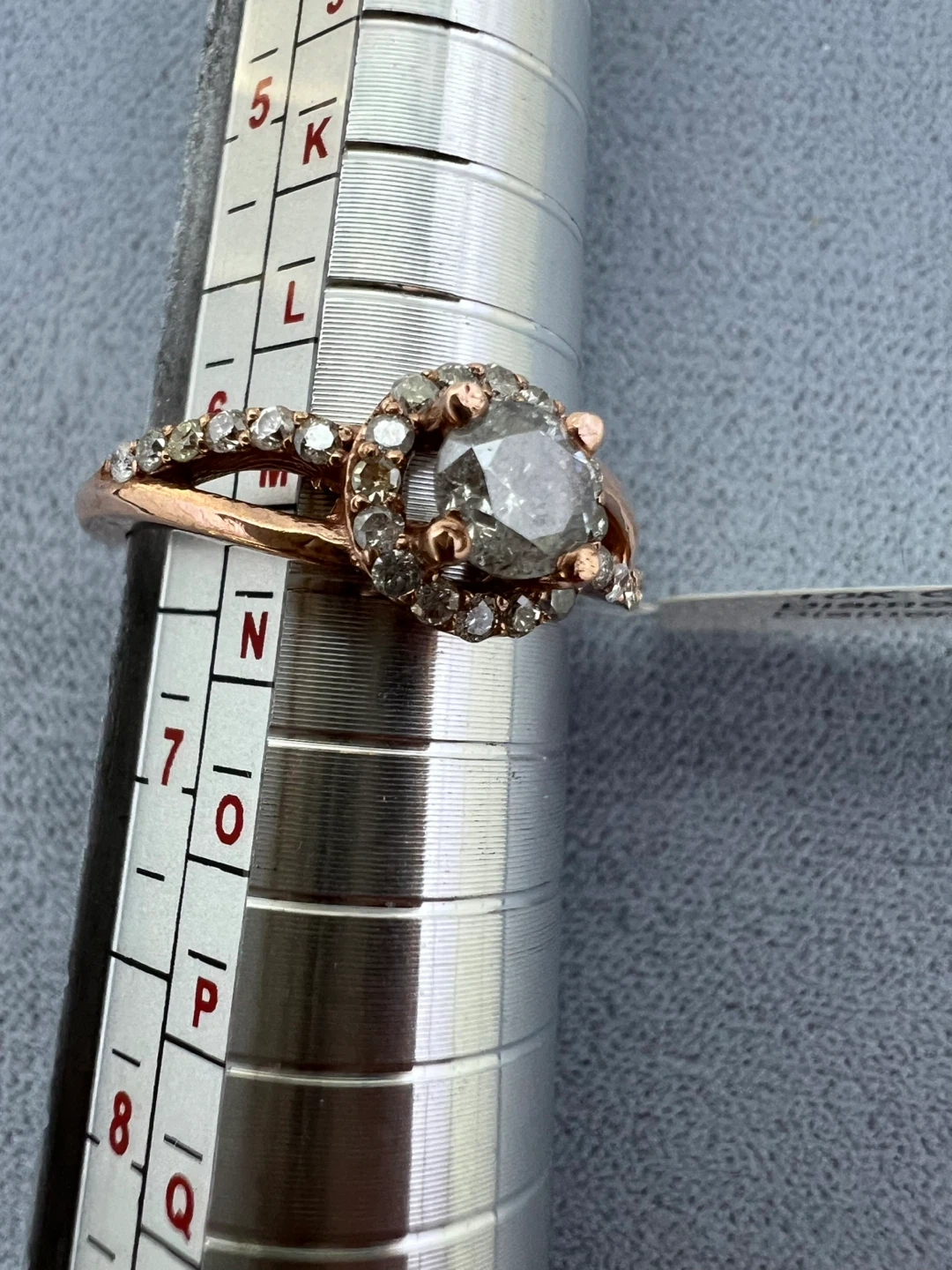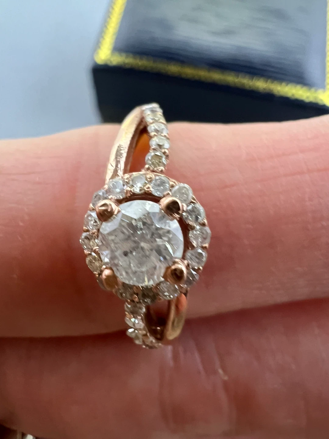 Stunning 10K rose gold ring featuring a .35 carat diamond centre stone surrounded by .30 carats of smaller diamonds