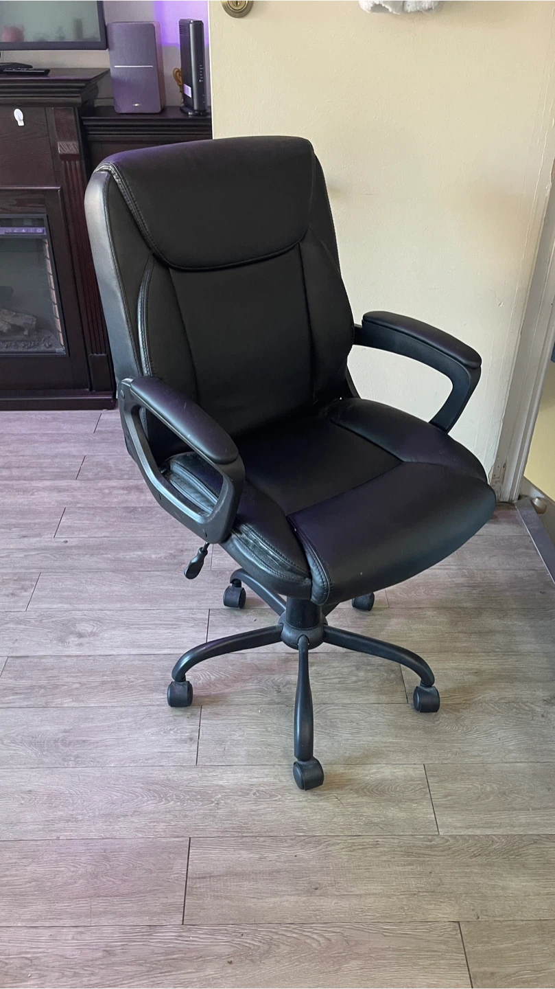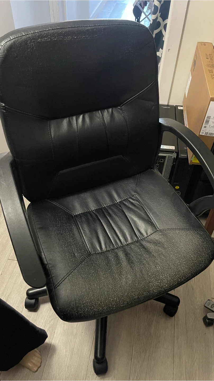 Selling a black office chair! It's perfect for your home office or study space. The chair has a comfortable design, but there are some signs of wear on the seat