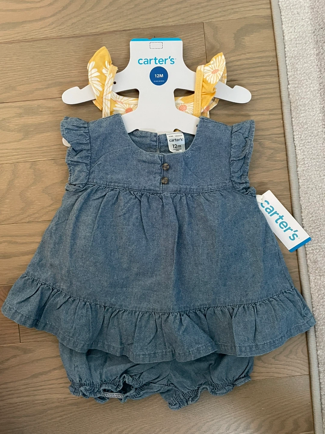 This adorable Carter's outfit is brand new with tags and ready for your little one! It's a size 12M and features a cute yellow floral bodysuit paired with a denim-look dress and bloomer set. Perfect for spring or summer!