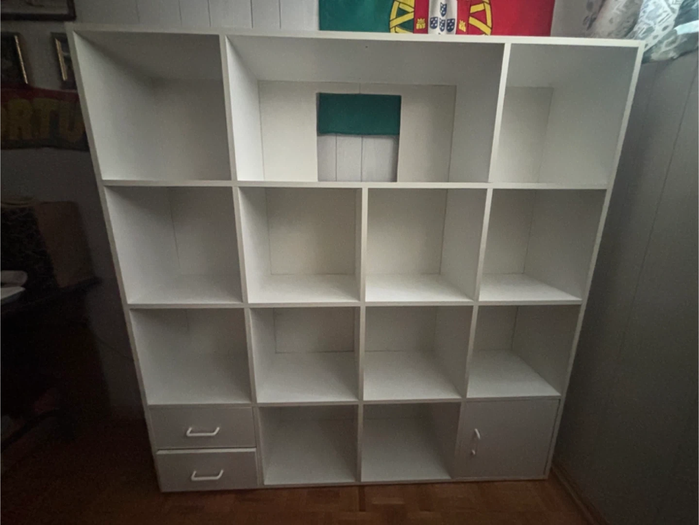 Selling a white shelf unit. It has 16 open shelves and 2 drawers at the bottom. There's also a cabinet with a door. It's in good condition and ready for a new home! Measures 58-1/4 x 58-1/4 x 12”d. Pick up at Islington and Finch. Must be able to carry it out yourself.