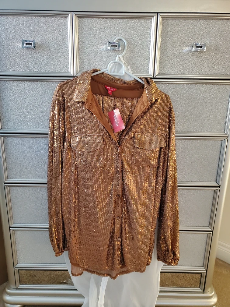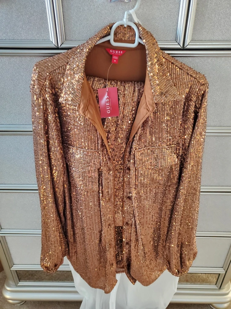 Selling a Guess sequin shirt and pant in size medium. It's a beautiful piece that adds some sparkle to any outfit!
