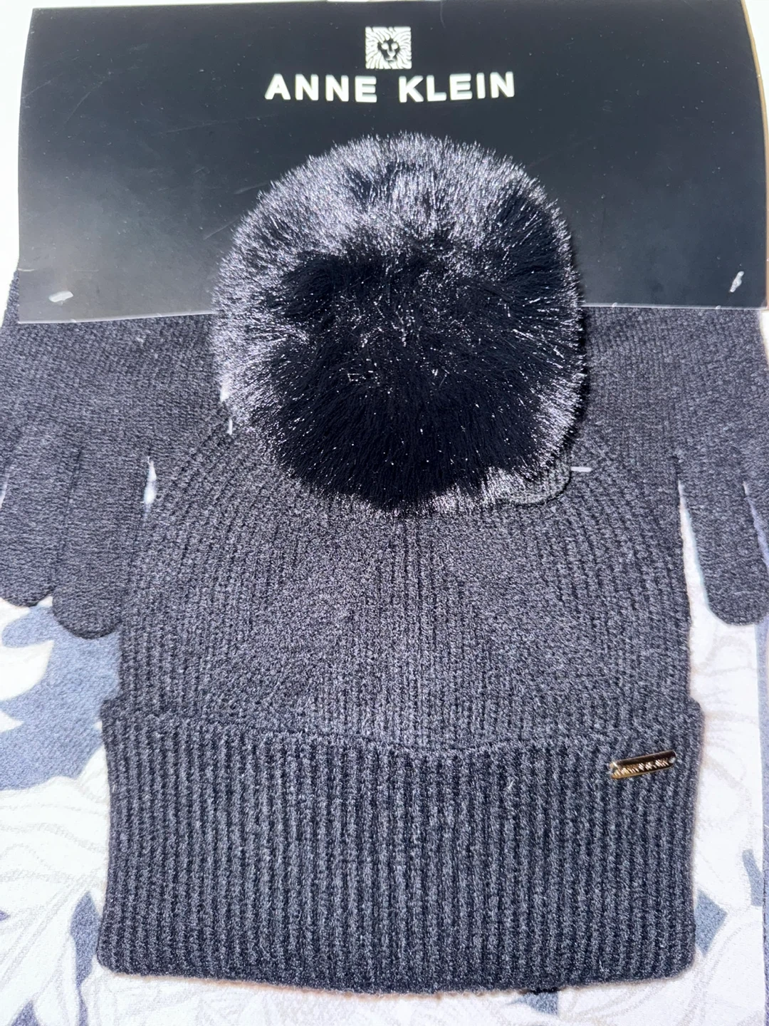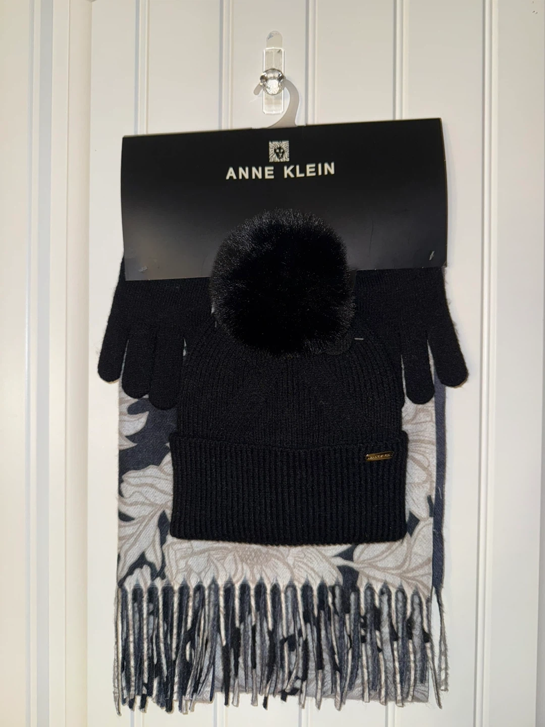Brand new Anne Klein hat, gloves, and scarf set! The set includes a black pompom beanie, matching gloves, and a floral print scarf. Perfect for keeping warm and stylish this winter