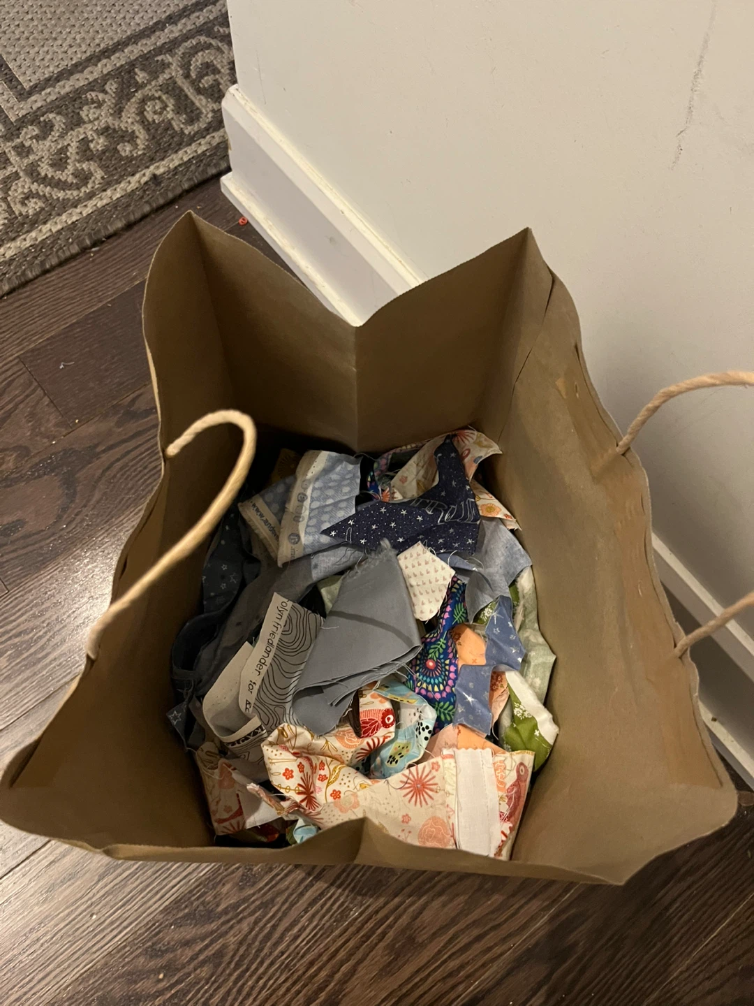 A collection of fabric scraps, perfect for quilting, patchwork, or other creative projects! There's a variety of colours and patterns to inspire your next sewing adventure